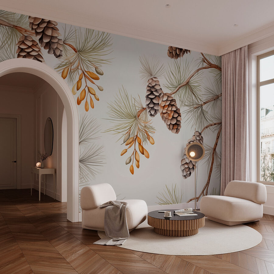 S touto očarujúcou nástennou maľbou s krásnym tancom šišiek a ihličia premeníte každú miestnosť na lesné útočisko. Predstavte si, ako sa uvelebujete pri šálke kávy, vzduchom sa šíri vôňa čerstvých borovíc a táto nástenná maľba vytvára pokojné pozadie. Je to ako preniesť si veľkú prírodu priamo do svojho domova – nie sú potrebné turistické topánky! Tieto prírodné tóny robia zázraky a dodávajú priestorom pocit tepla a prívetivosti. Či už ide o obývaciu izbu alebo útulný kútik, táto nástenná maľba dodáva nádych rustikálnej krásy, ktorá určite vyvolá radosť a možno aj jedno či dve dobrodružstvá v prírode.