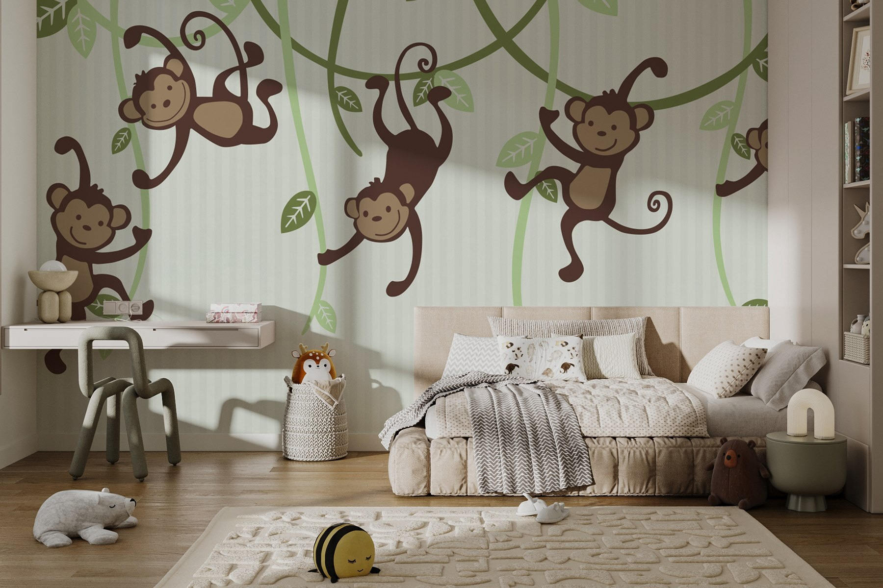Premeňte akýkoľvek priestor pomocou tejto hravej nástennej maľby so skupinkou drzých opíc, ktoré sa hojdajú na lianách. Predstavte si to: útulne sa usadíte v detskej izbe alebo v detskej izbe, obklopení týmito rozkošnými malými výtržníkmi. Prinášajú okamžitý príval radosti a neplechy a každému pripomínajú, že život by mal byť zábavný. Či už ide o rozprávku, alebo len o lenivé popoludnie, tieto opičky dokážu vyvolať chichot a predstavivosť. Jemná zelená a hnedá farba sa dokonale hodí do každého interiéru a vytvára hrejivú, príjemnú atmosféru. Stačí jeden pohľad a je ťažké neusmievať sa. Perfektne sa hodí na doplnenie rozmarného nádychu vašich stien!