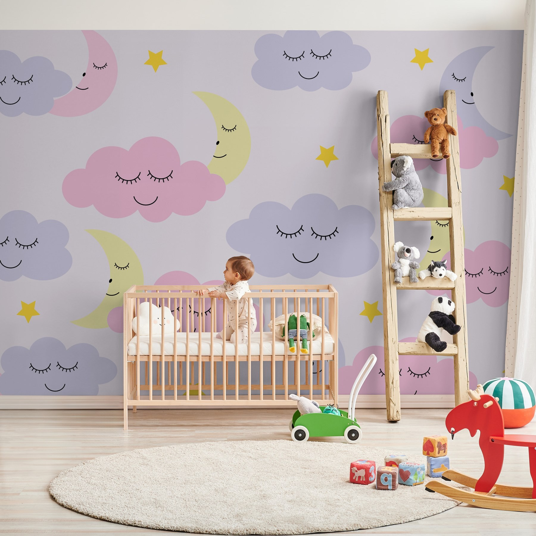 S touto rozkošnou nástennou maľbou s veselými obláčikmi, hravými hviezdičkami a spiacimi mesiačikmi premeníte priestor každého dieťatka na zasnenú svätyňu. Je to, akoby nočná obloha dostala veselú premenu! Predstavte si tie úsmevy počas rozprávky, keď deti ležia pod nadýchanými ružovými a fialovými obláčikmi a snívajú sladké sny. Každý prvok je ako hrejivé objatie, ktoré nabáda k predstavivosti a úžasu. Ideálny do detskej izby alebo herne, nie je to len dekorácia, ale útulný únik, kde sa sny rozletia a dobrodružstvá sa začnú. Kto by sa nechcel nechať unášať touto krásnou scénou?