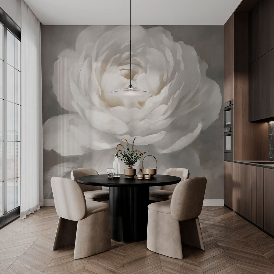Vstúpte do pokojnej atmosféry s touto nástennou maľbou so zasneným bielym kvetom, ktorý je odborne skombinovaný s jemnými listovými akcentmi. Predstavte si, že vstúpite do priestoru, v ktorom sa budete cítiť ako v jemnom vánku počas jarného rána. Pokojné tóny vytvárajú príjemnú atmosféru ideálnu na oddych po dlhom dni. Je to takmer akoby kvetina našepkávala tajomstvá pokoja a obnovy. Či už je táto nástenná maľba umiestnená v útulnom čitateľskom kútiku alebo v bezveternej chodbe, premení všednosť na niečo výnimočné. Je to druh dekorácie, ktorá môže dokonca inšpirovať k snivému snívaniu – komu by to nepomohlo? Ponorte sa do sveta, kde príroda a umenie spolu tancujú a rozospievajú vaše steny.