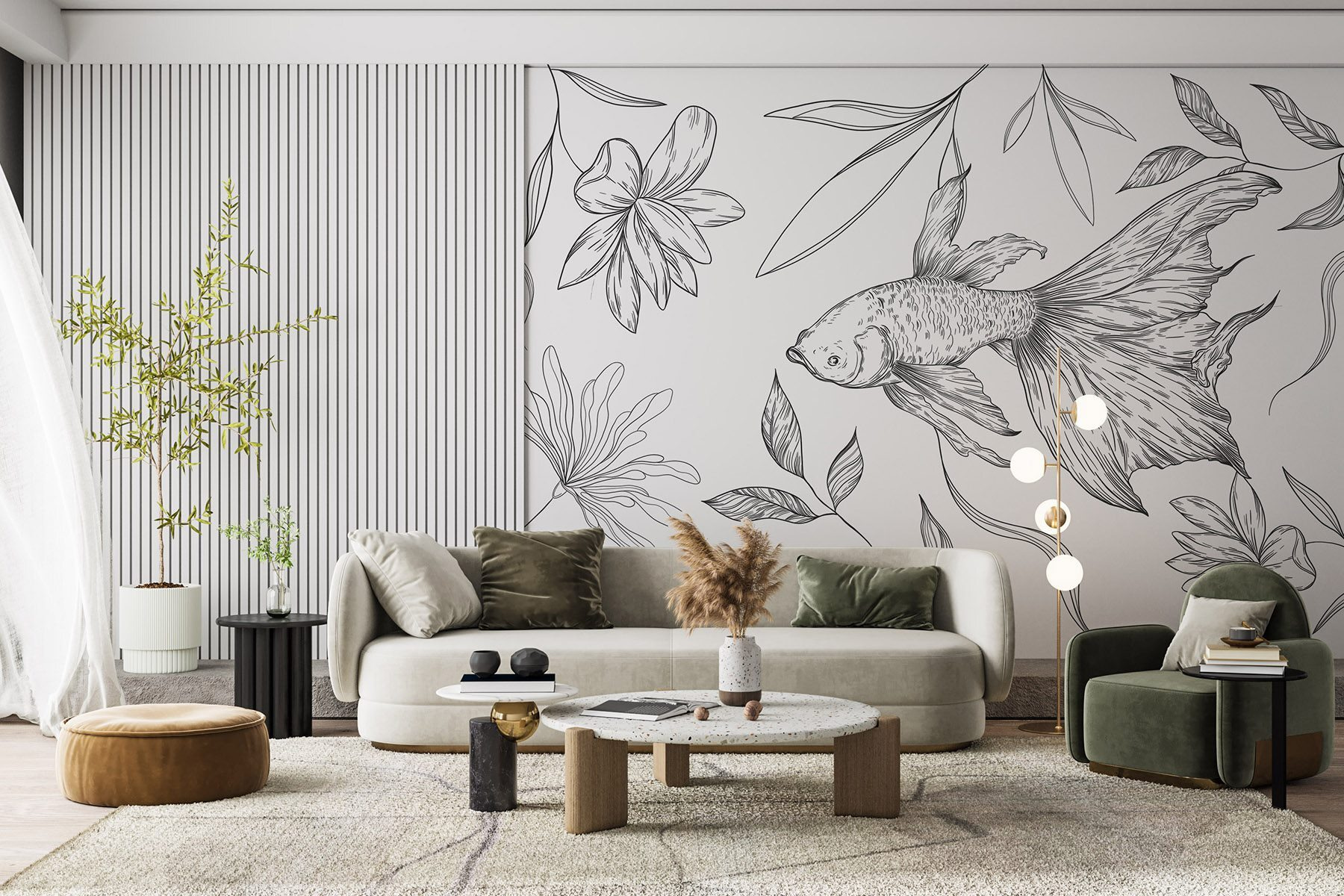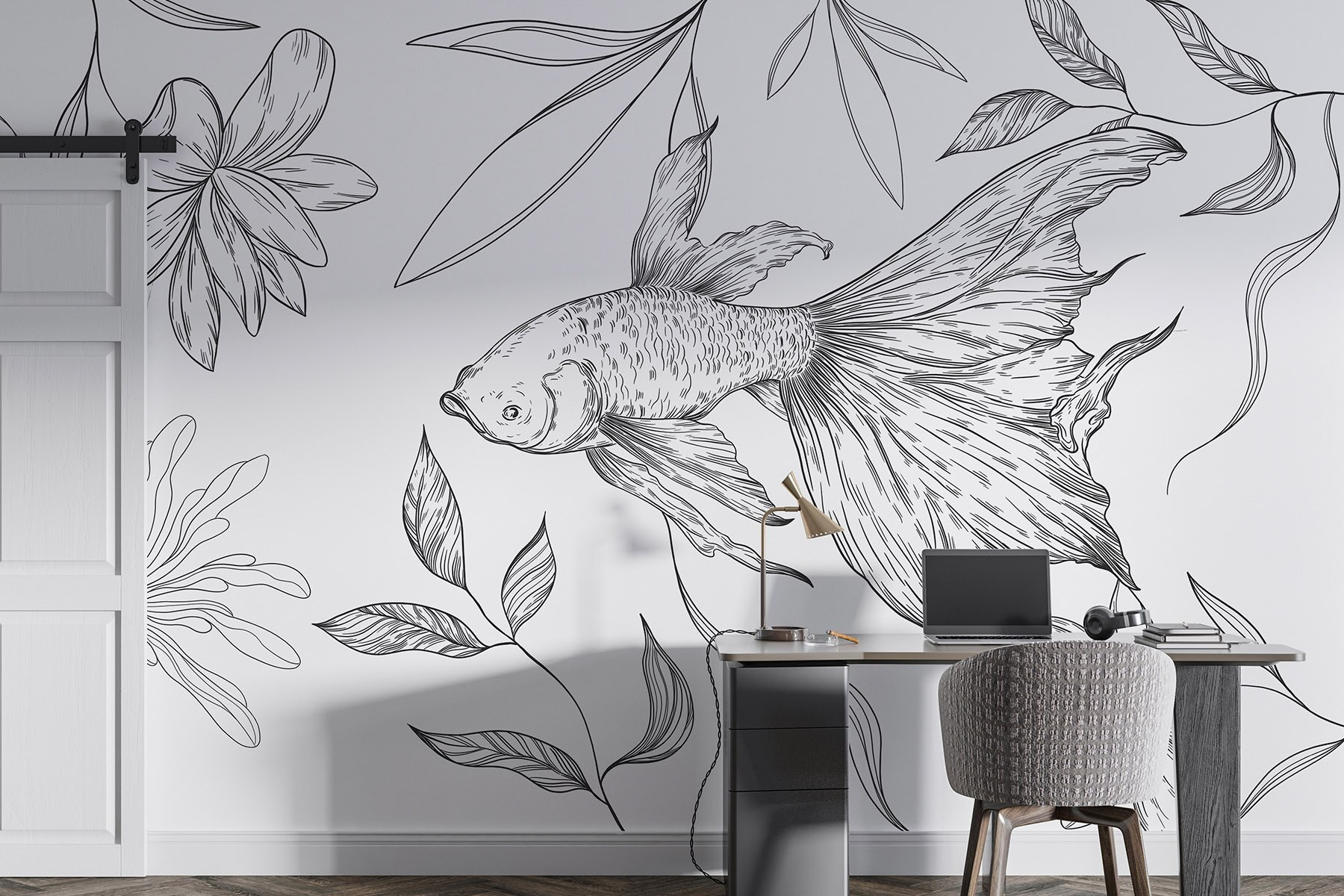 Premeňte akýkoľvek priestor pomocou tejto podmanivej nástennej maľby s očarujúcou rybou kĺzajúcou medzi jemnými rastlinami. Čiernobiely dizajn prináša jedinečný vkus a dodáva miestnosti nádych elegancie bez toho, aby ju zahltil. Predstavte si, ako popíjate kávu, jemné línie tancujú na stene a podnecujú upokojujúce myšlienky a kreatívne nápady. Je to ako šepot prírody, ktorý pozýva k pokoju do vášho zhonu. Je ideálny pre každého, kto chce svoje steny posypať umeleckým kúzlom, a zároveň je to aj podnet na rozhovor. Kto by sa nechcel rozprávať o “kamarátovi na plávanie” na svojej stene?