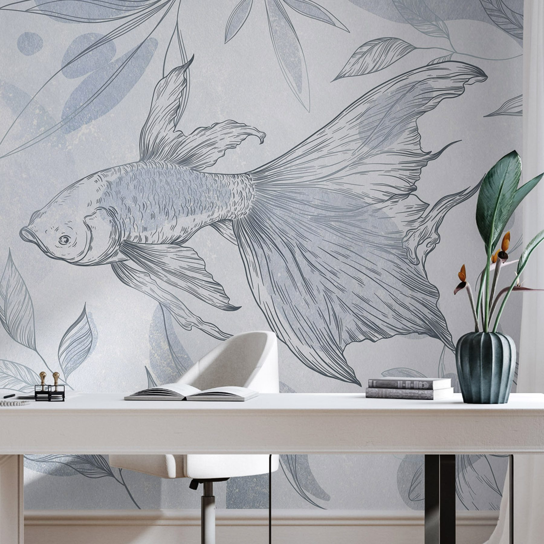 Ponorte sa do pokojného podmorského sveta s touto očarujúcou nástennou maľbou s krásnou rybou kĺzajúcou medzi jemnými rastlinami. Je to ako mať svoju osobnú vodnú scénu, ktorá dodá pokojnú atmosféru každej miestnosti. Predstavte si, že popíjate rannú kávu a do pohľadu vám vpláva tento nežný tvor, ktorý okamžite rozjasní priestor. Mierny akvarelový štýl pôsobí ako závan čerstvého oceánskeho vzduchu, ktorý dodáva jemný, prívetivý nádych. Perfektne sa hodí do útulného zákutia alebo dokonca do hravej detskej izby, kde šepká pokoj a zároveň vzbudzuje zvedavosť. Kto by nechcel mať na stene rybieho kamaráta?