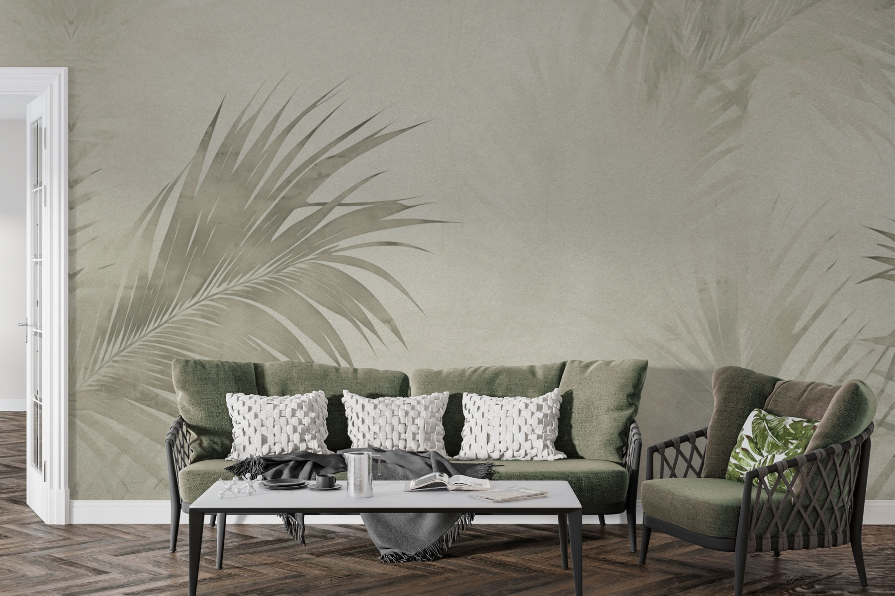 Premeňte akúkoľvek miestnosť na tropický únik s touto nástennou maľbou s jemnými palmovými listami na upokojujúcom neutrálnom pozadí. Akoby ste si priniesli kúsok raja priamo do svojho domova! Predstavte si, ako leňošíte s knihou, obklopení touto jemnou zeleňou, a popíjate niečo osviežujúce. Vďaka nenápadným farbám sa bez problémov začlení do vášho existujúceho interiéru a ponúkne pokojnú atmosféru bez toho, aby kričal o pozornosť.