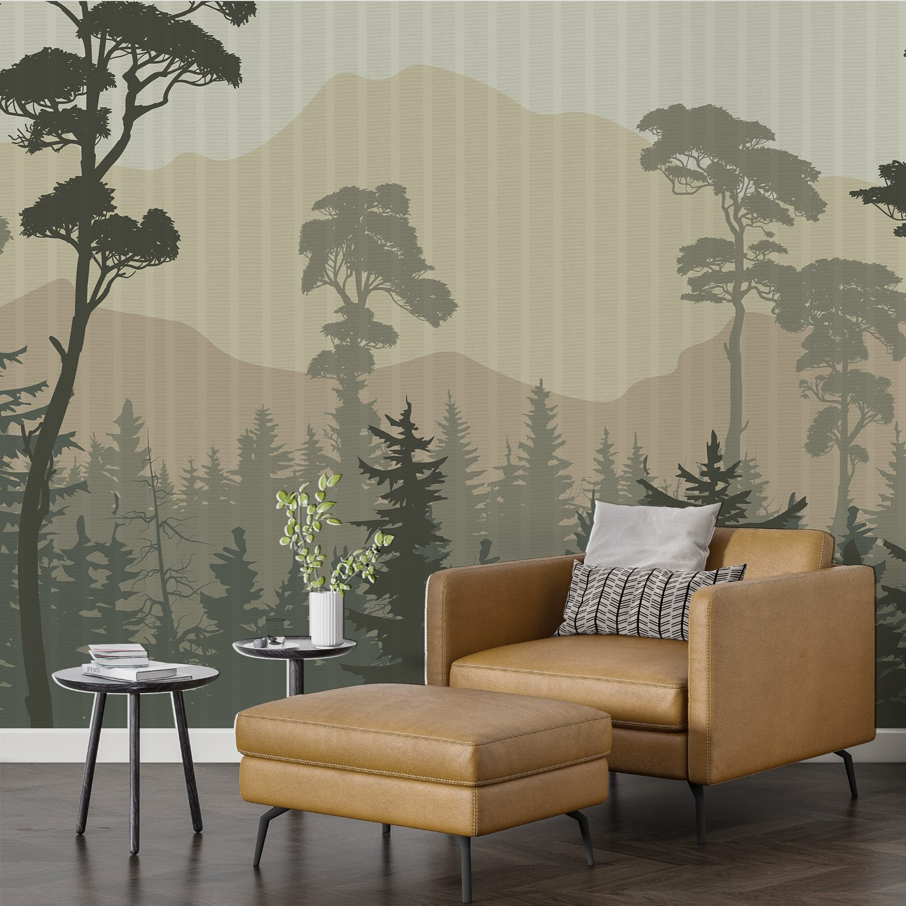 S touto nástennou maľbou “Krajina stromov a hôr” premeníte akýkoľvek priestor na pokojné útočisko. Predstavte si to: útulná obývacia izba alebo pokojná kancelária zaliata jemnými odtieňmi prírody.