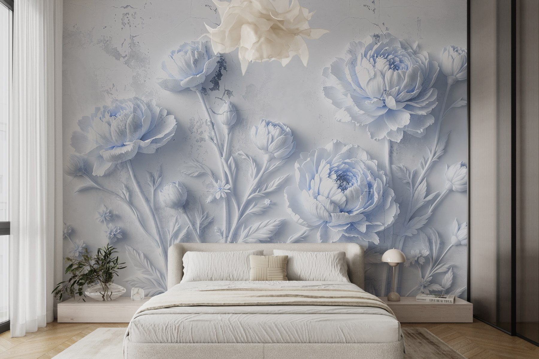 Premeňte svoj priestor pomocou tejto zasnenej nástennej maľby s jemnými bielymi kvetmi, ktoré sú dokonale umiestnené na mäkkom pozadí. Predstavte si, že vstúpite do miestnosti, ktorá bude pripomínať pokojnú záhradu – bez slnečného svetla! Tieto pivonky sú také realistické, že možno pozvú včely na malý rozhovor. Jemná hra tieňov vytvára scénu, ktorá je takmer sochárska, a kto by sa nechcel cítiť ako v malom kúsku raja? Ideálne pre útulný kútik alebo stenu, ktorá si žiada trochu lásky. Prečo čakať s preniknutím do exteriéru?