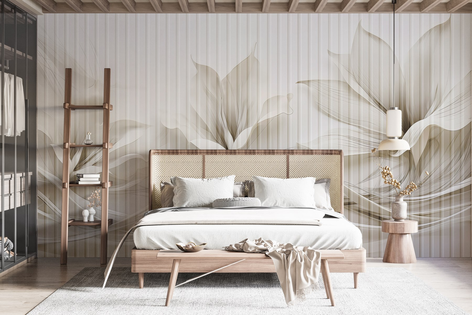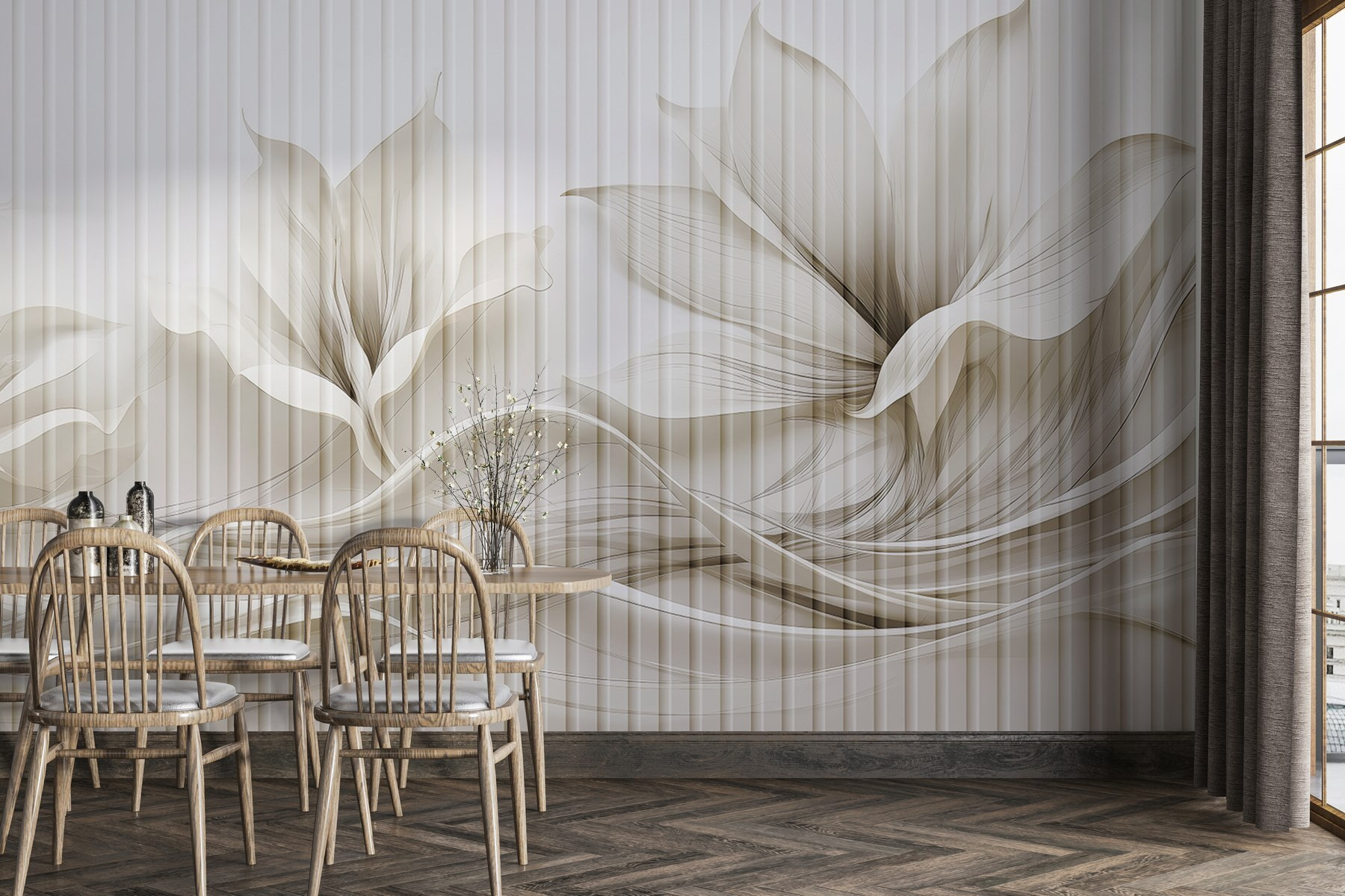 Premeňte svoj priestor pomocou tejto úžasnej nástennej maľby s elegantným kvetinovým vzorom prepleteným plynulými líniami. Predstavte si, že vstúpite do miestnosti, kde jemné, tlmené odtiene okamžite upokojujú zmysly. Je to ako závan čerstvého vzduchu! Táto fototapeta nie je len dekoráciou, ale aj jemnou pripomienkou krásy prírody. Predstavte si, ako organizujete schôdzky pri káve alebo príjemné večery, kde každý pohľad na stenu vyvoláva radosť. Priatelia sa možno dokonca opýtajú, kde ste našli takýto skvost. Je to dokonalá kombinácia moderného vkusu a nadčasového šarmu, ktorá bez námahy vytvára príjemnú atmosféru. Ideálne pre tých, ktorí chcú osviežiť svoj domov bez toho, aby zahltili zmysly.