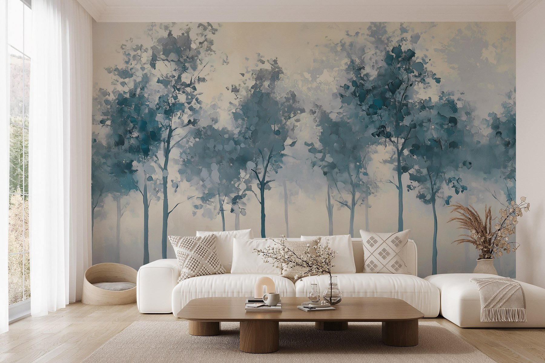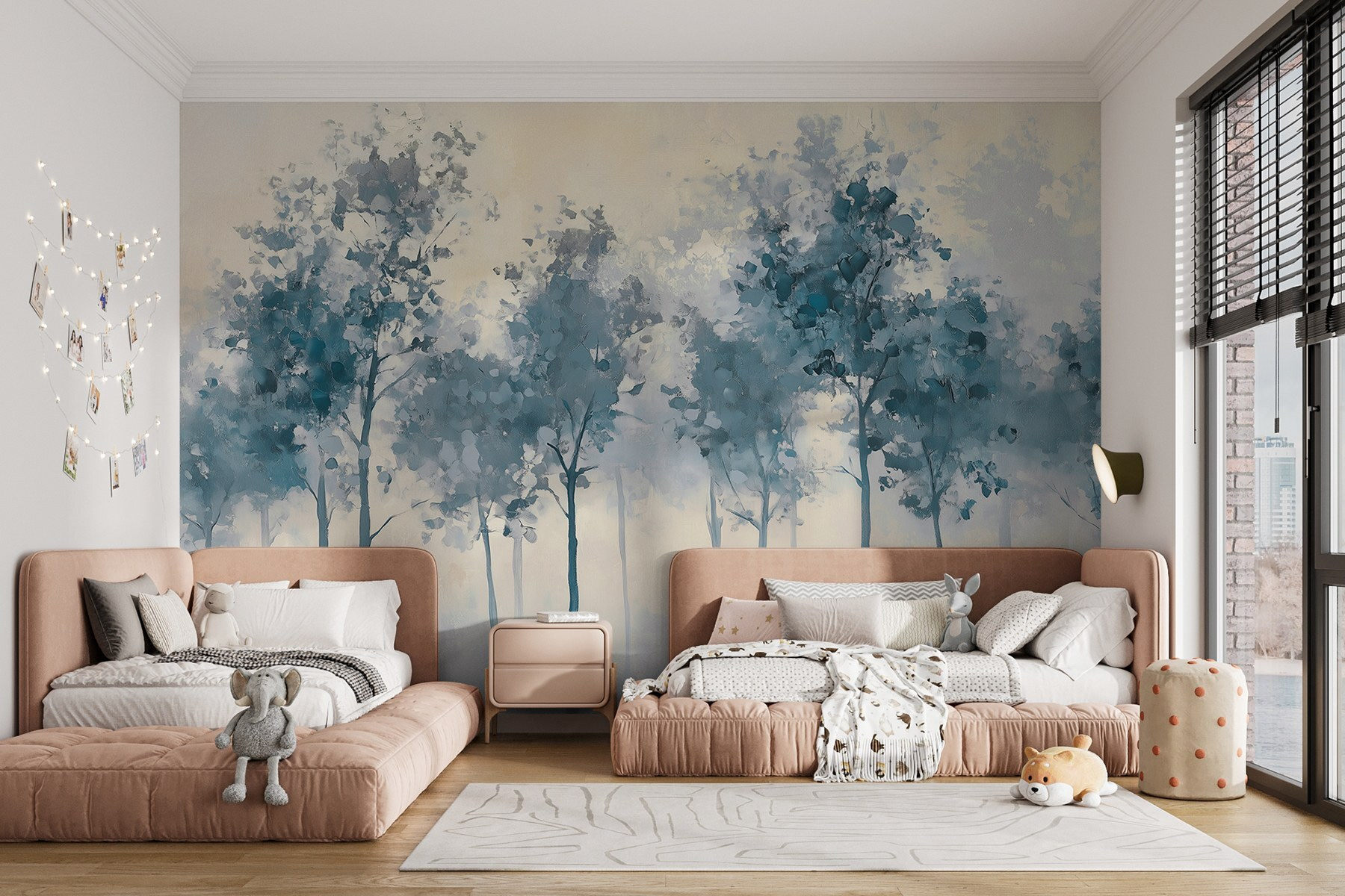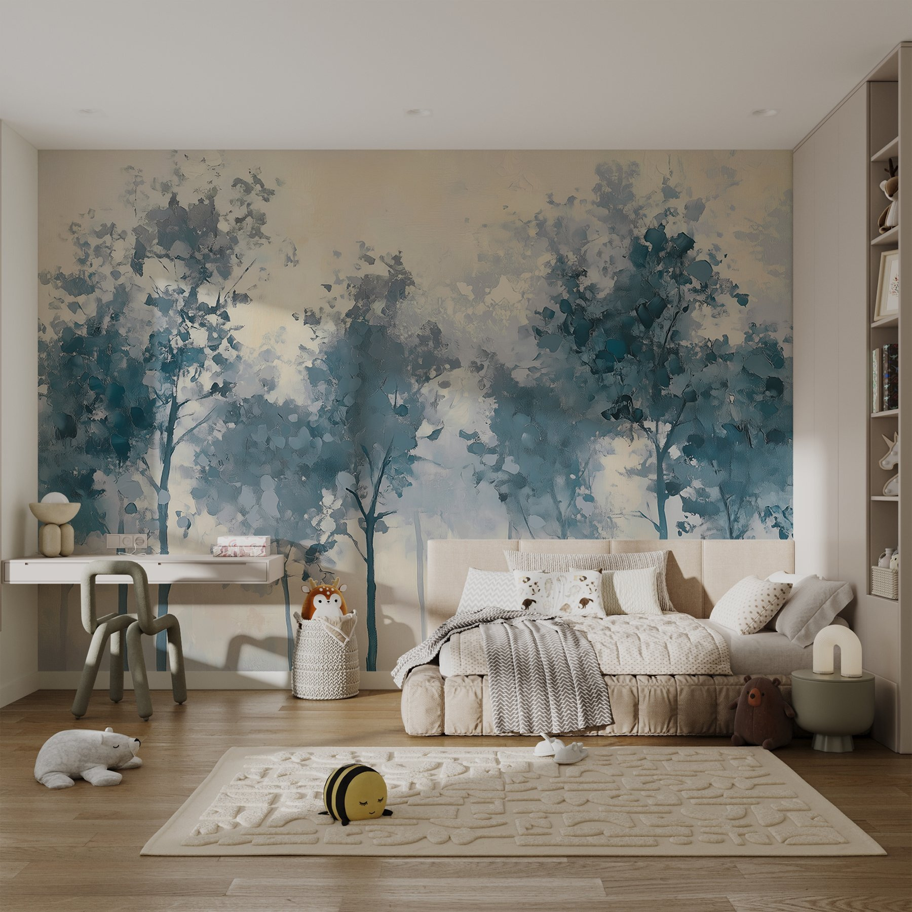 Predstavte si pokojný les, v ktorom stoja vysoké stromy ticho zahalené v hmle. Táto nástenná maľba “Skupina stromov v hmle” dokonale zachytáva tento čarovný okamih. Jemná modrá a nežná zelená sa plynule prelínajú a vytvárajú zasnené pozadie, ktoré upokojuje dušu. Je to ako preniesť si kúsok prírody do interiéru bez potreby zalievania. Predstavte si ho v útulnom čitateľskom kútiku, kam sa dá uniknúť s knihou a šálkou teplého čaju. Každý pohľad pôsobí ako pokojné útočisko, ktoré premení akýkoľvek priestor na upokojujúce útočisko – nie sú potrebné turistické topánky. Ideálny pre milovníkov prírody alebo pre každého, kto chce mať doma trochu pokoja.