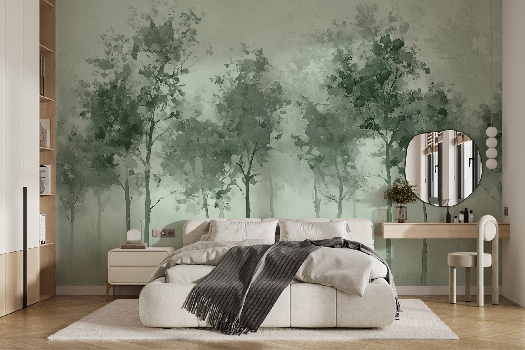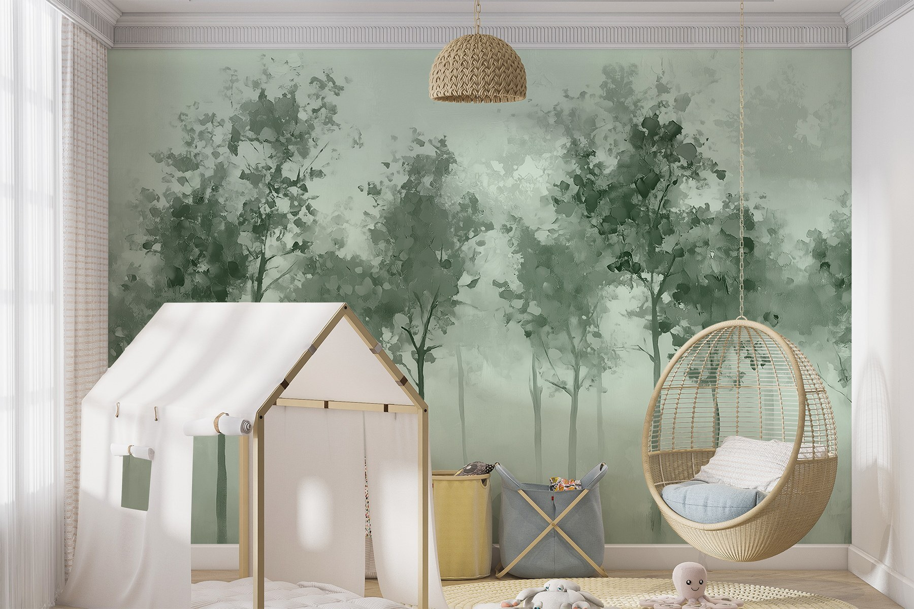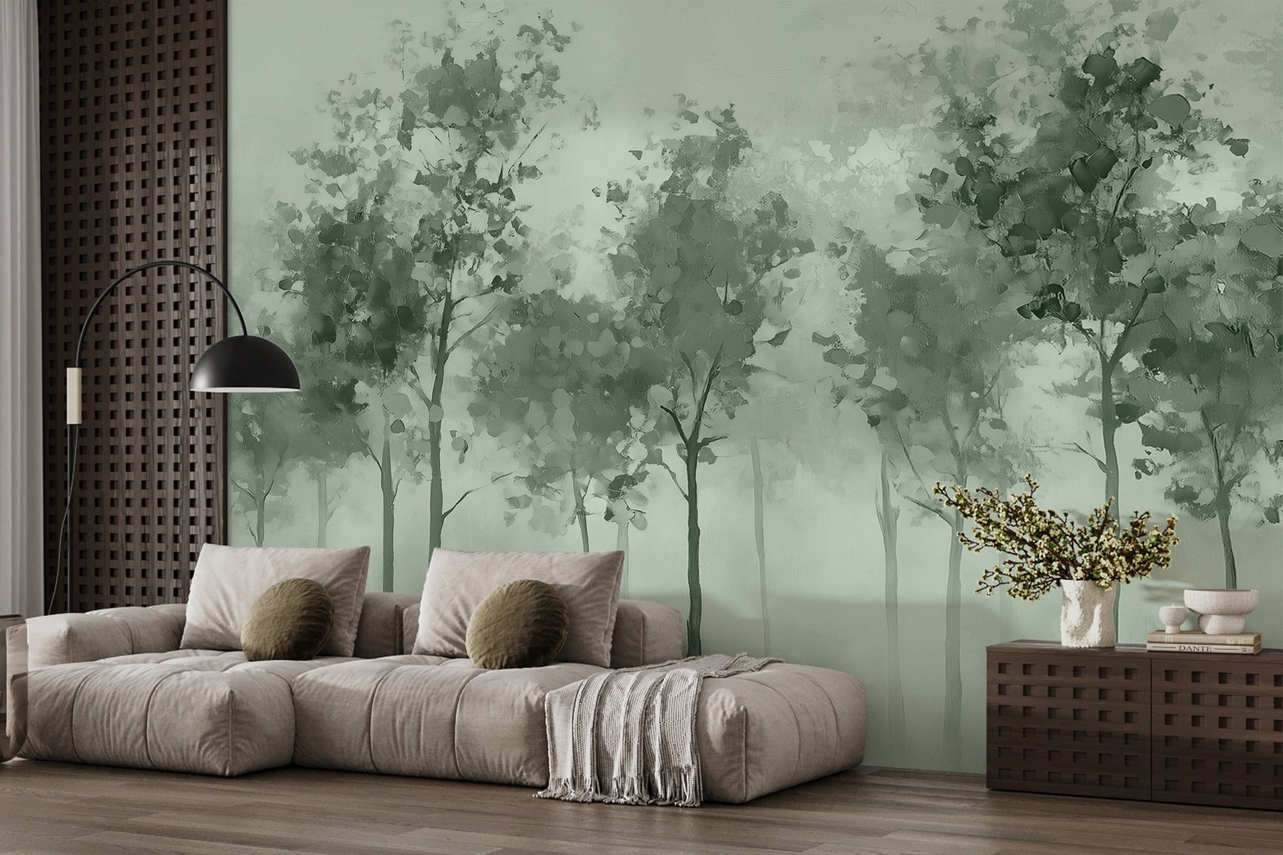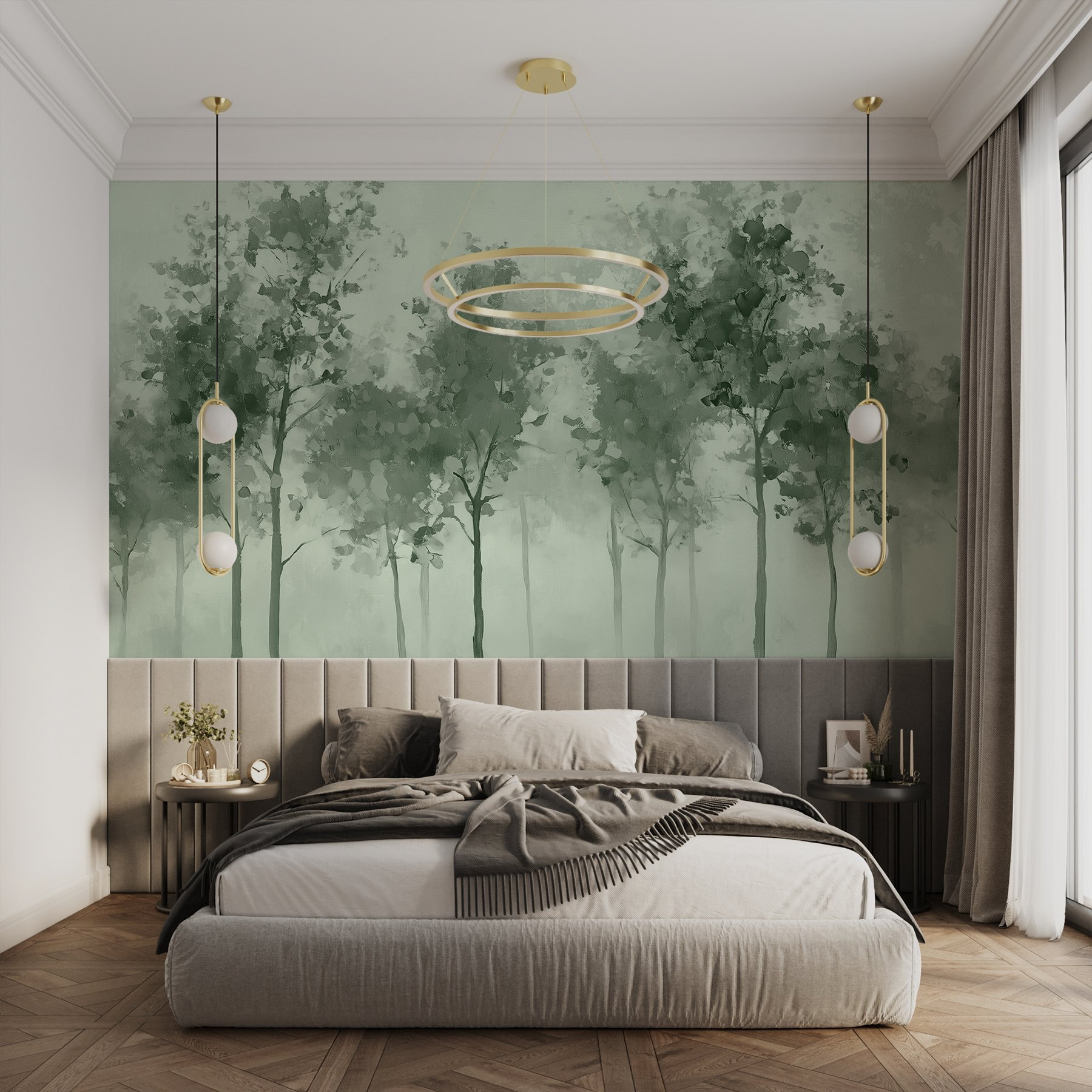 Jemná zeleň a akvarelový efekt vytvárajú upokojujúcu atmosféru, ideálnu pre tých, ktorí si chcú po dlhom dni len oddýchnuť. Má tú snovú kvalitu, ktorá podnecuje predstavivosť – možno sa budete cítiť inšpirovaní na prechádzku v lese alebo si len vychutnáte pokojné chvíle doma. Či už ide o útulný kútik alebo výraznú stenu, táto nástenná maľba nabáda k pokoju a kráse, vďaka čomu je každý pohľad malým únikom z reality.