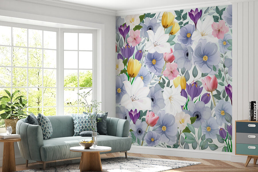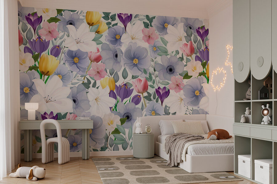 Predstavte si, že vstúpite do sveta, kde kvety kvitnú po celý rok. Táto nástenná maľba plná farebných kvetov a zelených listov prinesie do každej miestnosti príval radosti. Je to ako záhradná párty bez otravných včiel! Vďaka jemným akvarelovým ťahom rozpráva každý kvet svoj vlastný príbeh, takže sa budete cítiť takmer ako na potulkách rozmarnou lúkou.