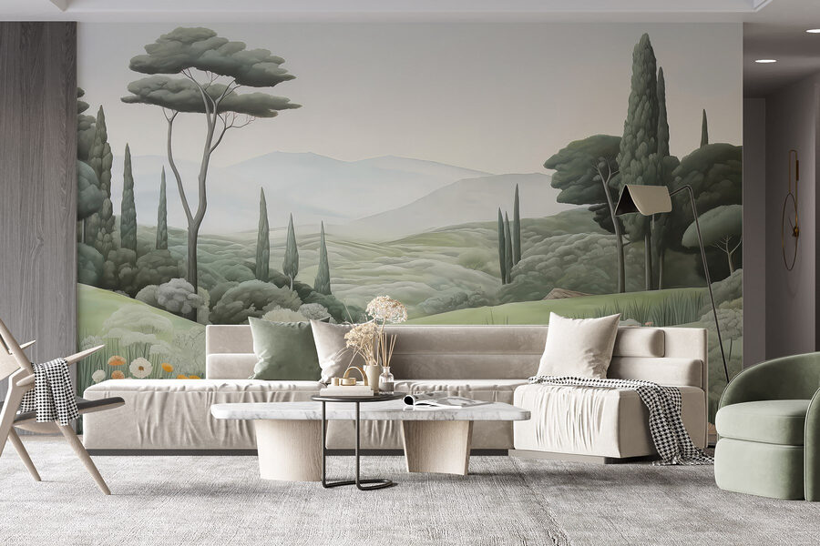 Premeňte svoj priestor pomocou tejto očarujúcej nástennej maľby s pokojnou krajinou s kľukatou cestou a pôvabnými stromami. Predstavte si, že zakaždým, keď vojdete do miestnosti, vstúpite priamo do pokojného úniku. Jemné odtiene zelenej a šepot prírody nabádajú k pocitu pokoja, čo je ideálne pre útulné večery, keď sa zdá, že je nevyhnutné sa ponoriť do vetra.