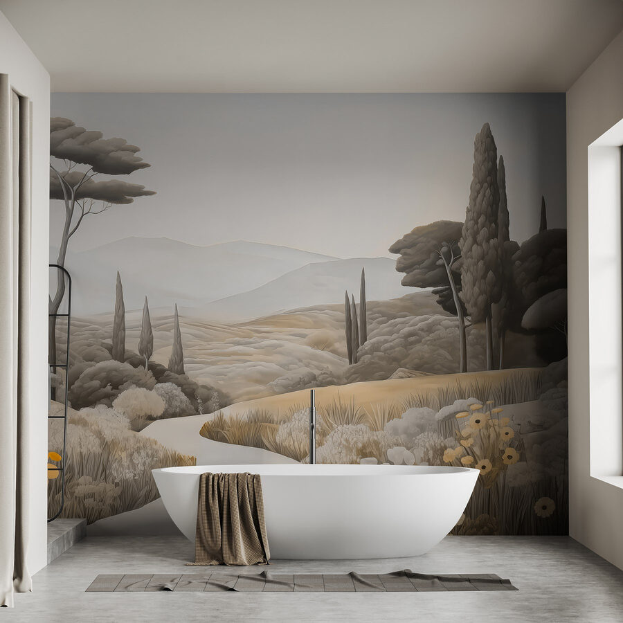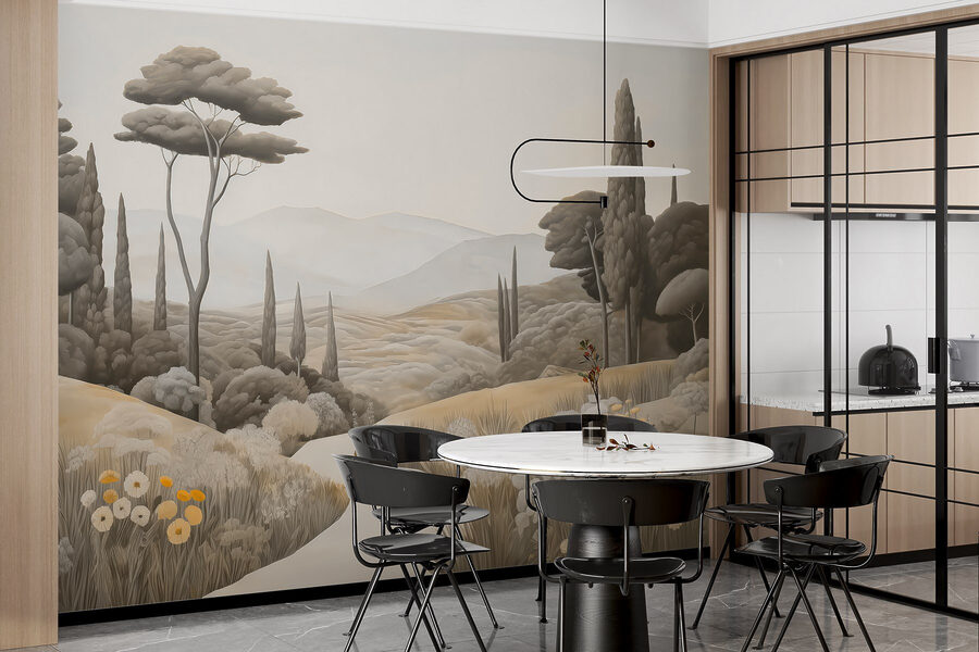 Premeňte svoj priestor pomocou tejto úžasnej nástennej maľby “Krajina s kľukatou cestou a stromami”. Oživuje pokojnú krajinu a pozýva do interiéru prírodu bez vonkajšieho neporiadku. Predstavte si, ako v lenivú nedeľu popíjate kávu a pritom sa pozeráte na mierne kopce a kývajúce sa stromy – je to ako mini dovolenka priamo na vašej stene. Táto nástenná maľba, ideálna pre tieto zasnené chvíle, zahalí vašu izbu do teplých, zemitých tónov a jemných detailov, ktoré vás prinútia zhlboka dýchať. Šepká uvoľnenie a pripomína vám pokojné prechádzky pod šírym nebom. Len si predstavte rozhovory, ktoré by mohla vyvolať, alebo pokojné vibrácie, ktoré prináša – čo je to sladký dotyk pre každý kút!