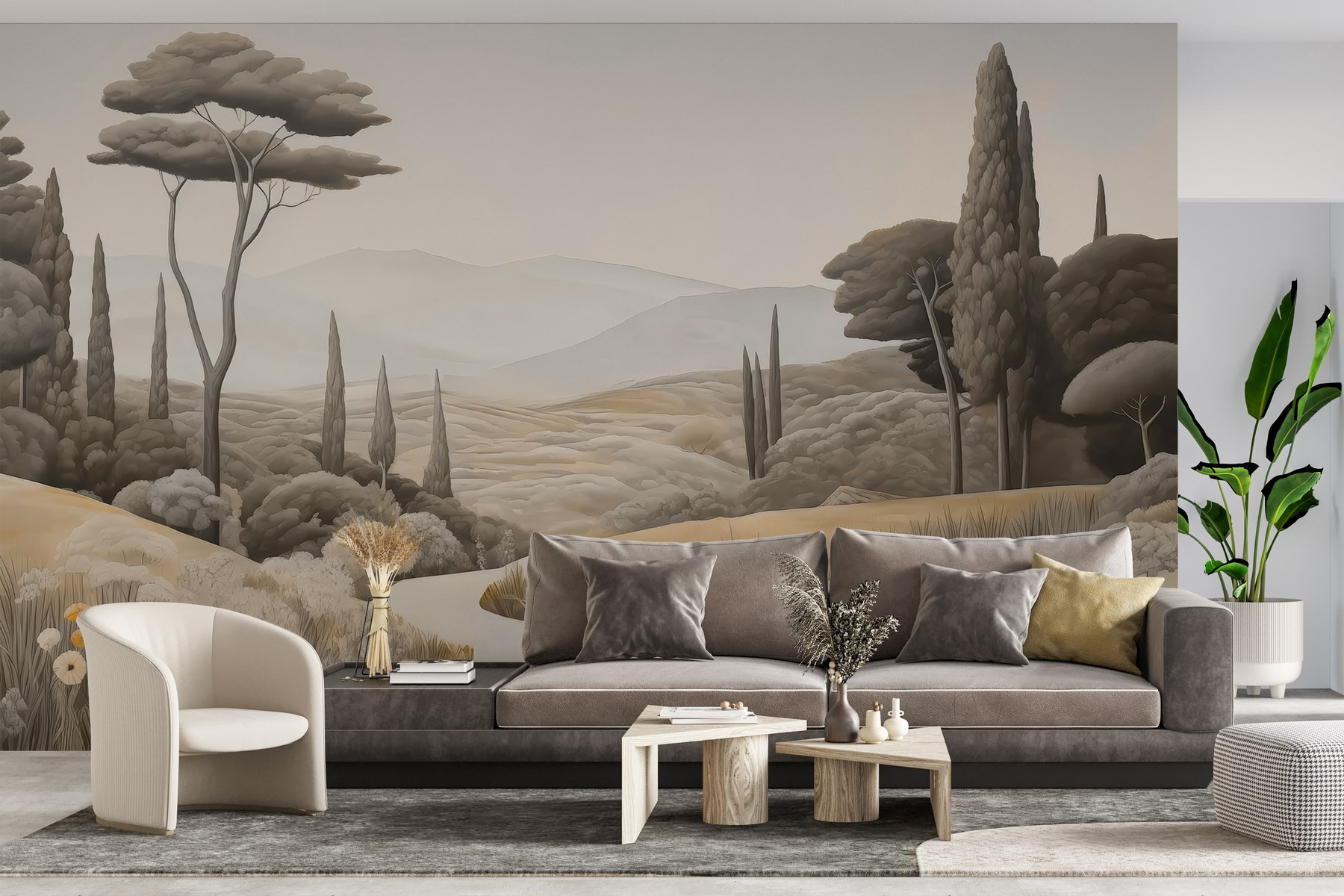 Premeňte svoj priestor pomocou tejto úžasnej nástennej maľby “Krajina s kľukatou cestou a stromami”. Oživuje pokojnú krajinu a pozýva do interiéru prírodu bez vonkajšieho neporiadku. Predstavte si, ako v lenivú nedeľu popíjate kávu a pritom sa pozeráte na mierne kopce a kývajúce sa stromy – je to ako mini dovolenka priamo na vašej stene. Táto nástenná maľba, ideálna pre tieto zasnené chvíle, zahalí vašu izbu do teplých, zemitých tónov a jemných detailov, ktoré vás prinútia zhlboka dýchať. Šepká uvoľnenie a pripomína vám pokojné prechádzky pod šírym nebom. Len si predstavte rozhovory, ktoré by mohla vyvolať, alebo pokojné vibrácie, ktoré prináša – čo je to sladký dotyk pre každý kút!