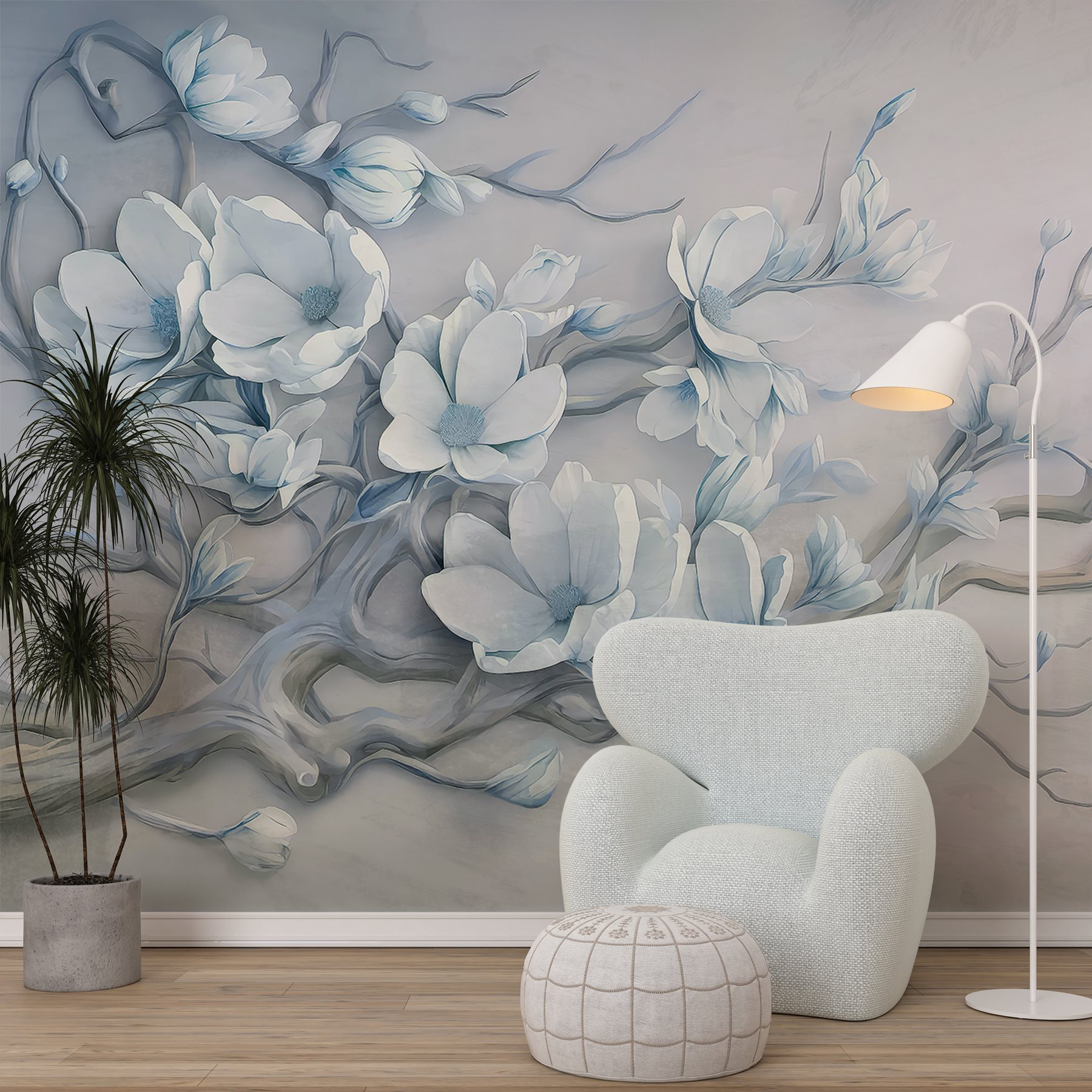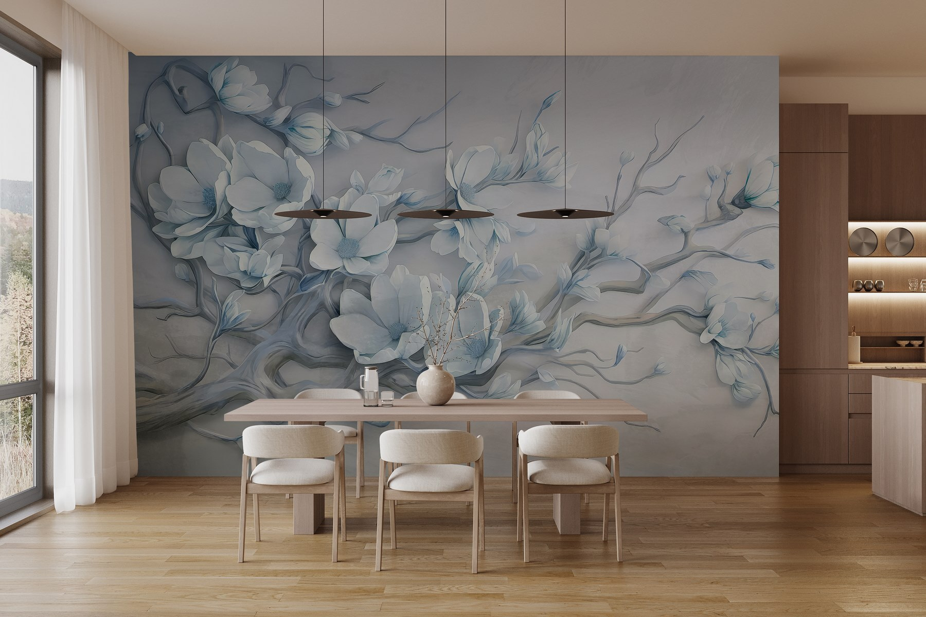 Premeňte svoj priestor pomocou tejto očarujúcej nástennej maľby s jemnými bielymi kvetmi na vetve. Je to ako priniesť jemný jarný vánok priamo do vášho domova. Upokojujúce odtiene a jemné línie vytvárajú upokojujúcu atmosféru – ideálnu pre útulný čitateľský kútik alebo pokojnú spálňu. Predstavte si, ako popíjate čaj pri pohľade na tieto kvety a cítite, ako sa stres z celého dňa rozplýva. Každý pohľad je ako malý únik do tichej záhrady. Nie je to len dekorácia, je to zážitok, ktorý pozýva do každej miestnosti teplo a eleganciu. Je tiež skutočným spúšťačom konverzácie – možno ju budú priatelia obdivovať rovnako ako vy!