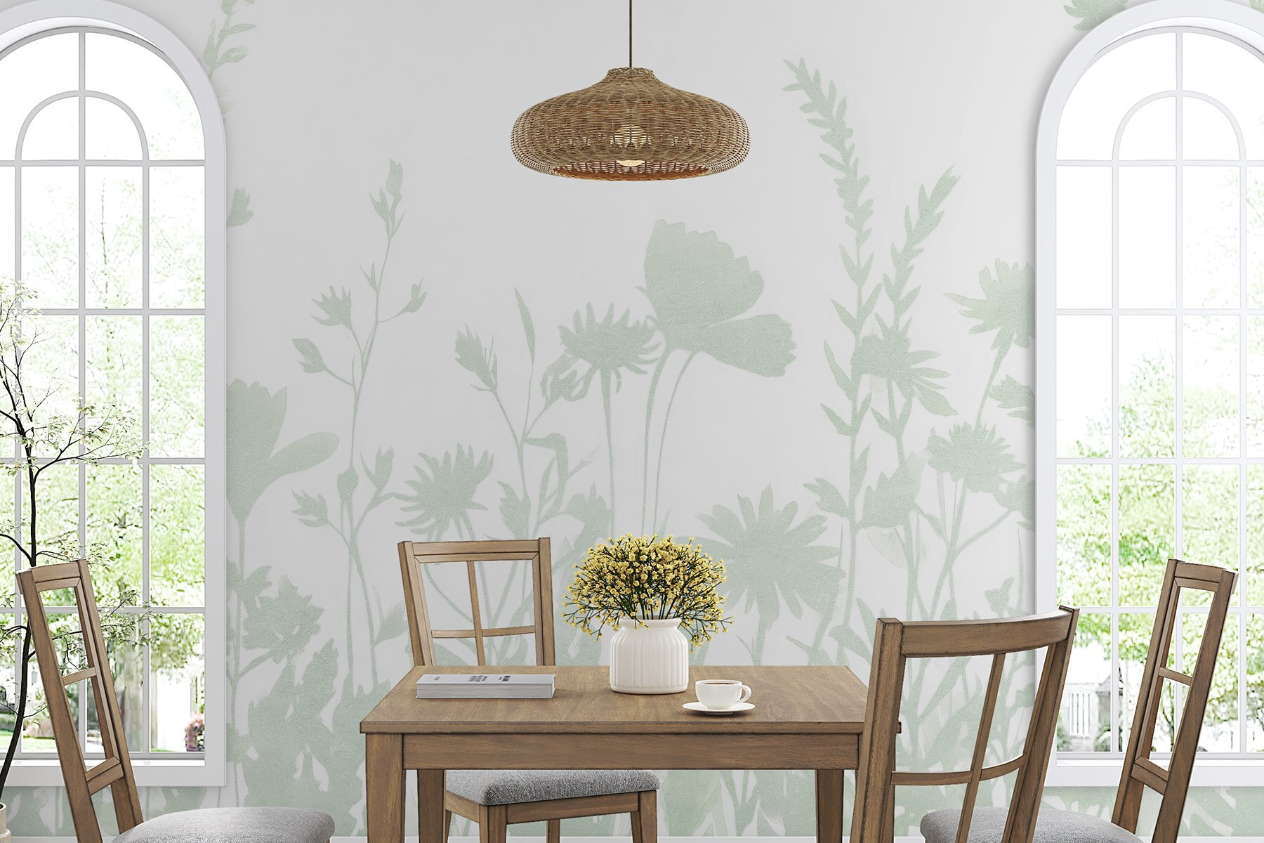Premeňte svoj priestor pomocou nástennej maľby “Jemné siluety kvitnúcich kvetov”. Predstavte si, že vojdete do miestnosti, ktorá pripomína pokojnú záhradu, kde jemná zeleň jemne klíči na ostrom bielom pozadí. Je to, akoby sa príroda rozhodla útulne usadiť v interiéri. Táto nástenná maľba šepká eleganciu bez toho, aby kričala o pozornosť, je ideálna pre tie tiché zákutia, kde tancuje slnečné svetlo a snívajú sa sny. Hostia sa možno zastavia, uchvátení krásnymi detailmi, a vy zistíte, že premieňa každodenné chvíle na niečo výnimočné. Je ideálny pre tých, ktorí zbožňujú svieže vibrácie, je to jemný spôsob, ako vdýchnuť život do každej miestnosti.
