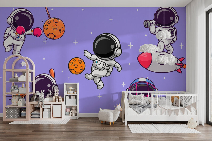 Predstavte si, že vstúpite do miestnosti, kde astronauti usporadúvajú vesmírnu párty – znie to zábavne, však? Táto nástenná maľba zachytáva túto hravú atmosféru s kreslenými astronautmi, ktorí poskakujú vo vesmíre a venujú sa rôznym činnostiam, od boxovania s mesačnými kameňmi až po približovanie na raketách. Je to ako živý príbeh odohrávajúci sa na vašej stene, ideálny pre deti alebo mladých srdcom. Predstavte si, ako sa vážne chvíle každodenného života rozjasnia, keď zahliadnete týchto bizarných vesmírnych bádateľov, ktorí vám pripomenú, aby ste prijali radosť a dobrodružstvo. Kto by nechcel mať kúsok vesmíru pokropený šťastím? Premeňte obyčajný priestor na nápaditý únik, kde sny lietajú!