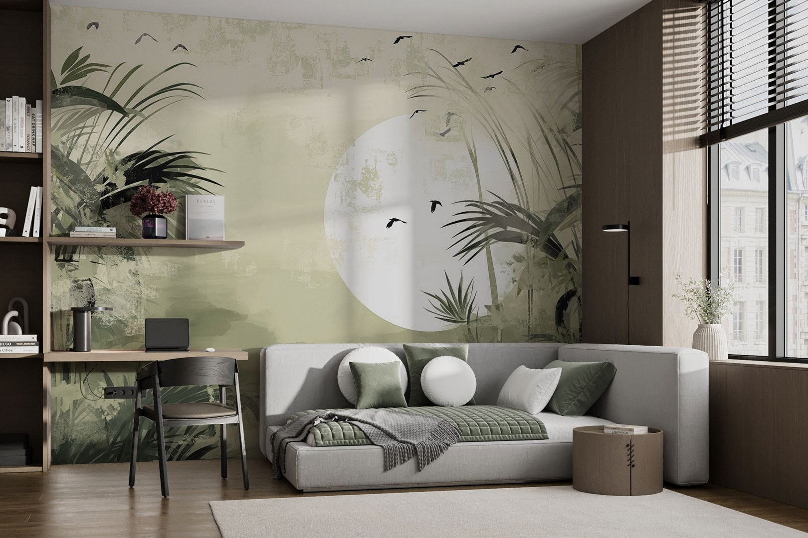 S touto nástennou maľbou tropického pralesa premeníte každú miestnosť na pokojné útočisko – akoby ste si do interiéru preniesli kúsok džungle bez hmyzu. Predstavte si, ako popíjate rannú kávu a pozeráte sa na sviežu zeleň a zasnený mesiac v nadrozmernej veľkosti. Táto nástenná maľba nielen zdobí, ale navodzuje pocit pokoja, ktorý je ideálny na oddych po dlhom dni. Priatelia sa budú prechádzať a budú mať pocit, že vstúpili do dažďového pralesa. Je to také pozadie, ktoré nabáda k dennému snívaniu a vyvoláva rozhovory. Kto by povedal, že stena môže niekoho preniesť do raja?