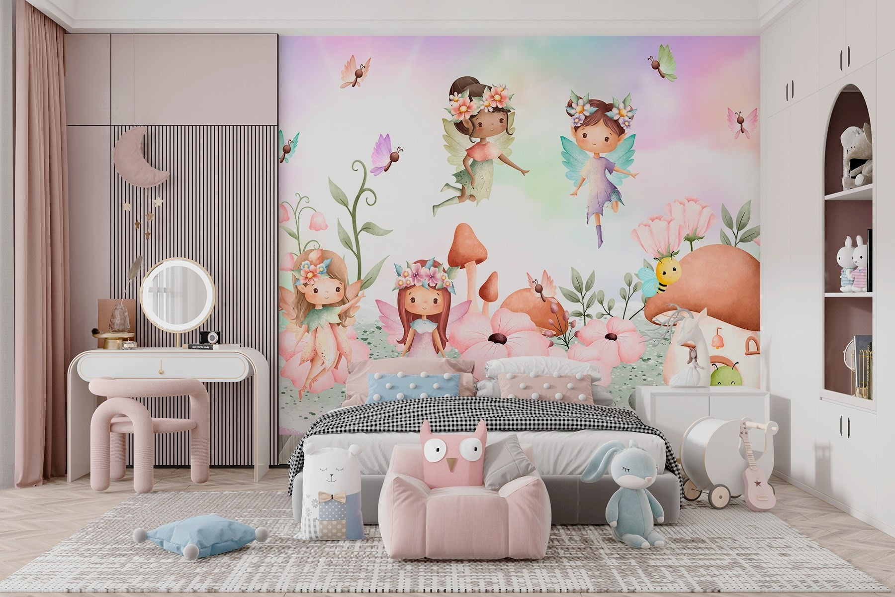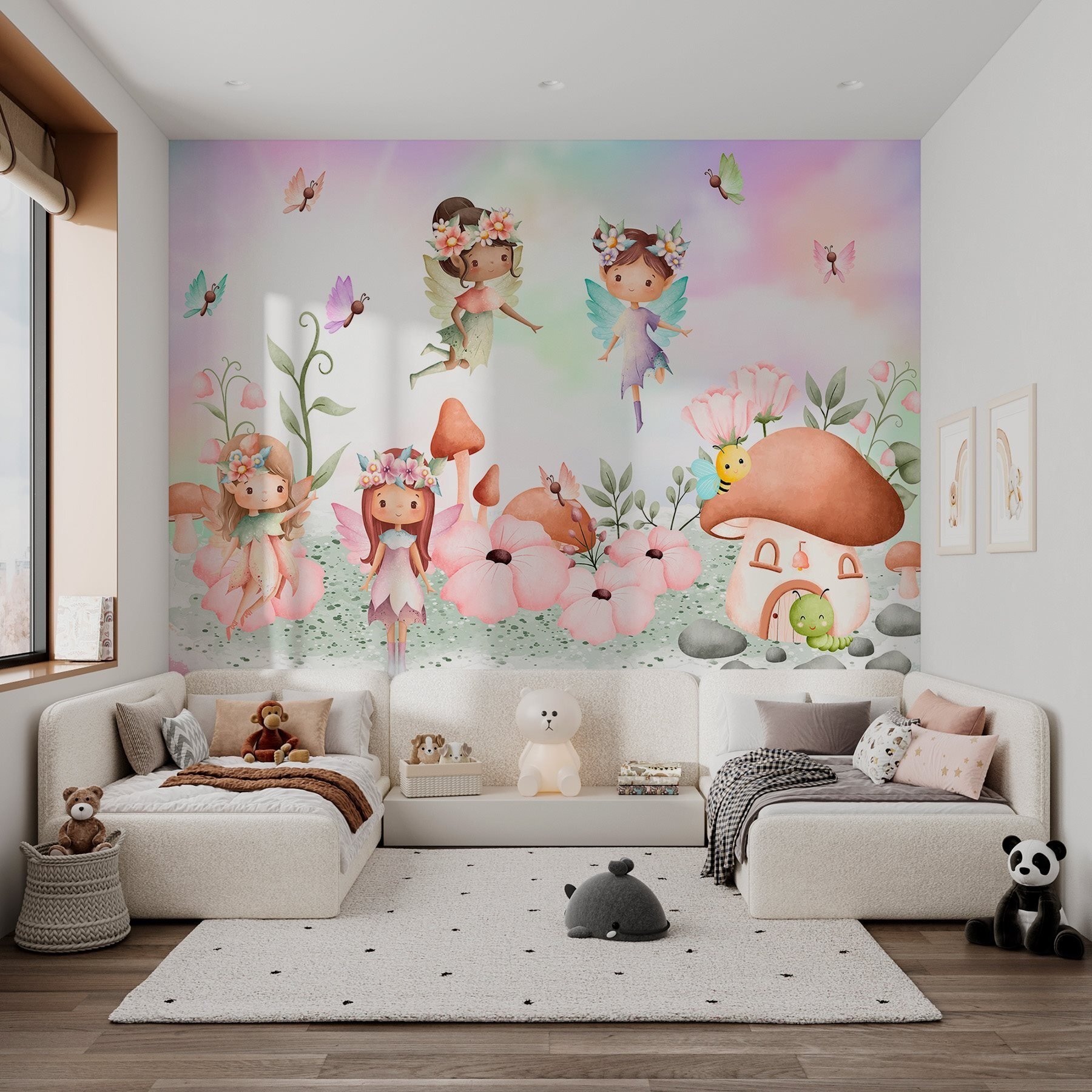 Premeňte akúkoľvek miestnosť na rozmarnú krajinu zázrakov s touto očarujúcou nástennou maľbou s rozkošnou skupinou víl, ktoré sa preháňajú v živej záhrade. Len si to predstavte: malé deti s úžasom hľadia na lietajúce víly a rozkvitnuté kvety. Je to dokonalá iskra kúzla pre detský priestor, ktorá roznieti ich predstavivosť ako prvé zatrepotanie motýľa. Možno si dokonca vytvoria vlastné rozprávky priamo v miestnosti! Navyše, kto by nemal rád malé včielky bzučiace okolo domčeka z húb? Je to ako vstúpiť každý deň do rozprávkovej knihy. Čaká vás skutočné dobrodružstvo!