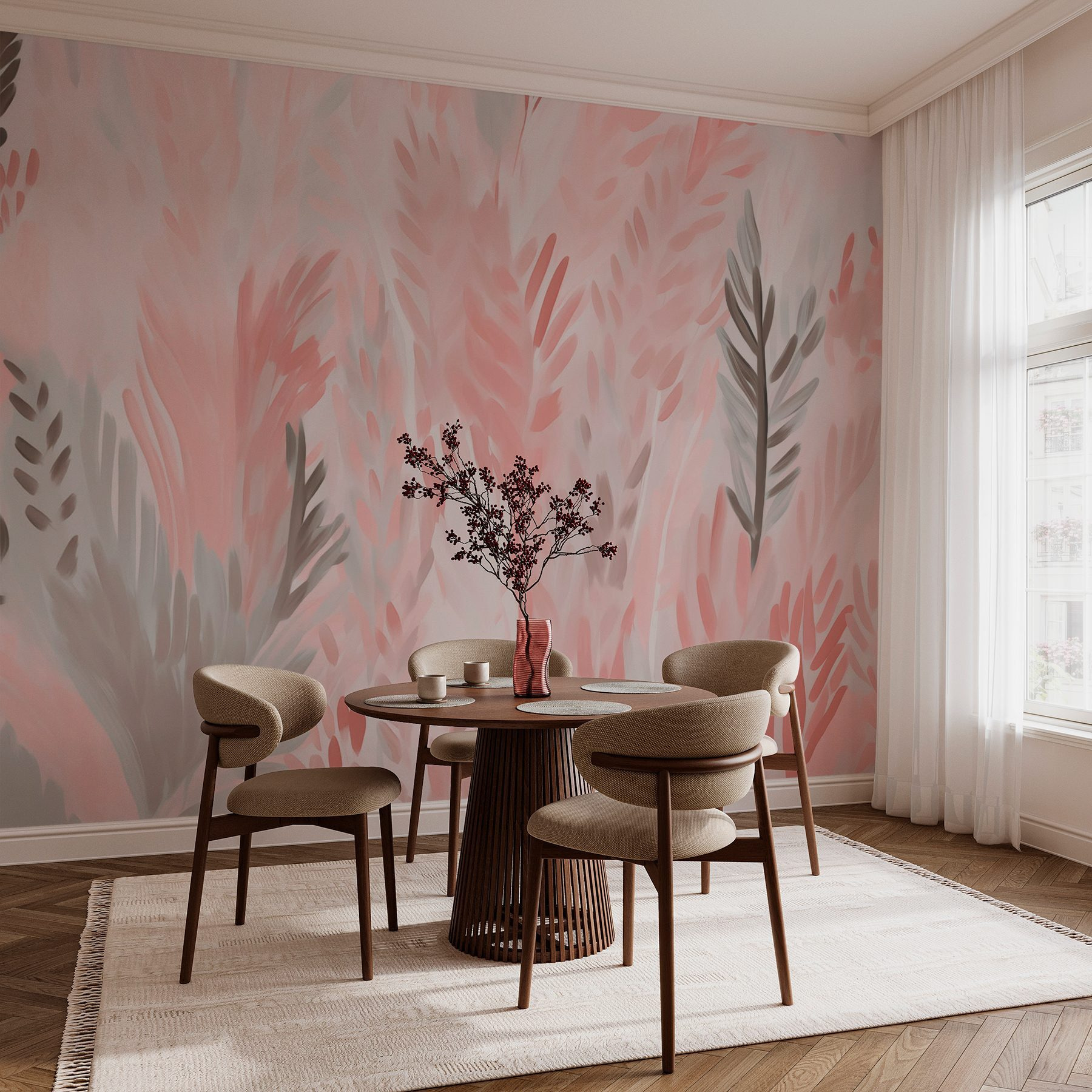 Premeňte každú miestnosť pomocou tejto očarujúcej nástennej maľby s ružovými a sivými listami. Akoby ste si priamo do svojho domova preniesli jemnú, pokojnú záhradu, ktorá je ideálna pre chvíle, keď vám Netflix nepomôže. Predstavte si, ako ležíte na pohovke obklopení týmto jemným prírastkom prírody a popíjate pritom svoj obľúbený nápoj. Je to takmer akoby každý list šepkal: “Uvoľni sa, zaslúžiš si to.” Upokojujúce odtiene bez námahy doplnia akýkoľvek interiér, vďaka čomu sa hodia na navodenie upokojujúcej atmosféry. Kto by nechcel, aby sa každý deň cítil ako pokojné útočisko? Táto nástenná maľba, ideálna do obývačky alebo spálne, môže inšpirovať k snívaniu vyššiemu ako strop!