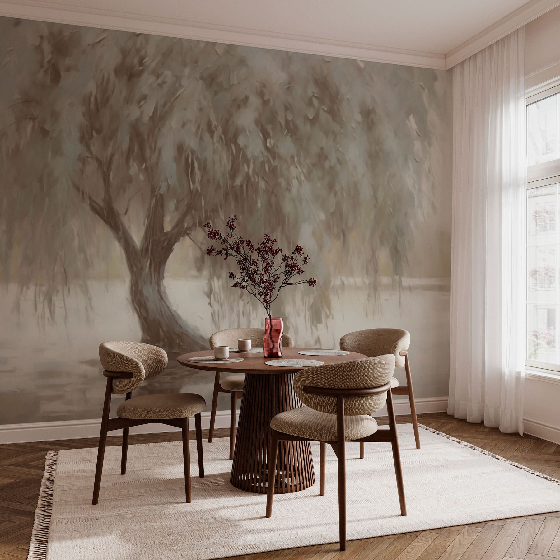 Premeňte svoj priestor pomocou upokojujúceho kúzla tejto nástennej maľby s pokojným stromom, ktorý sa ladne odráža v pokojných vodách. Je to ako mať pokojný únik priamo doma. Toto umelecké dielo, ktoré je ideálne na doplnenie akejkoľvek miestnosti o nádych prírody, našepkáva relaxáciu a pokoj. Predstavte si, že sa schúlite do klbka s knihou, teplým nápojom v ruke a budete sa pozerať na jeho jemné odtiene a zasnenú atmosféru. Nie je to len dekorácia; prináša jemný pokoj, ktorý vás obklopí ako teplá deka v chladný deň. Vaša stena sa možno stane najútulnejším miestom v dome!