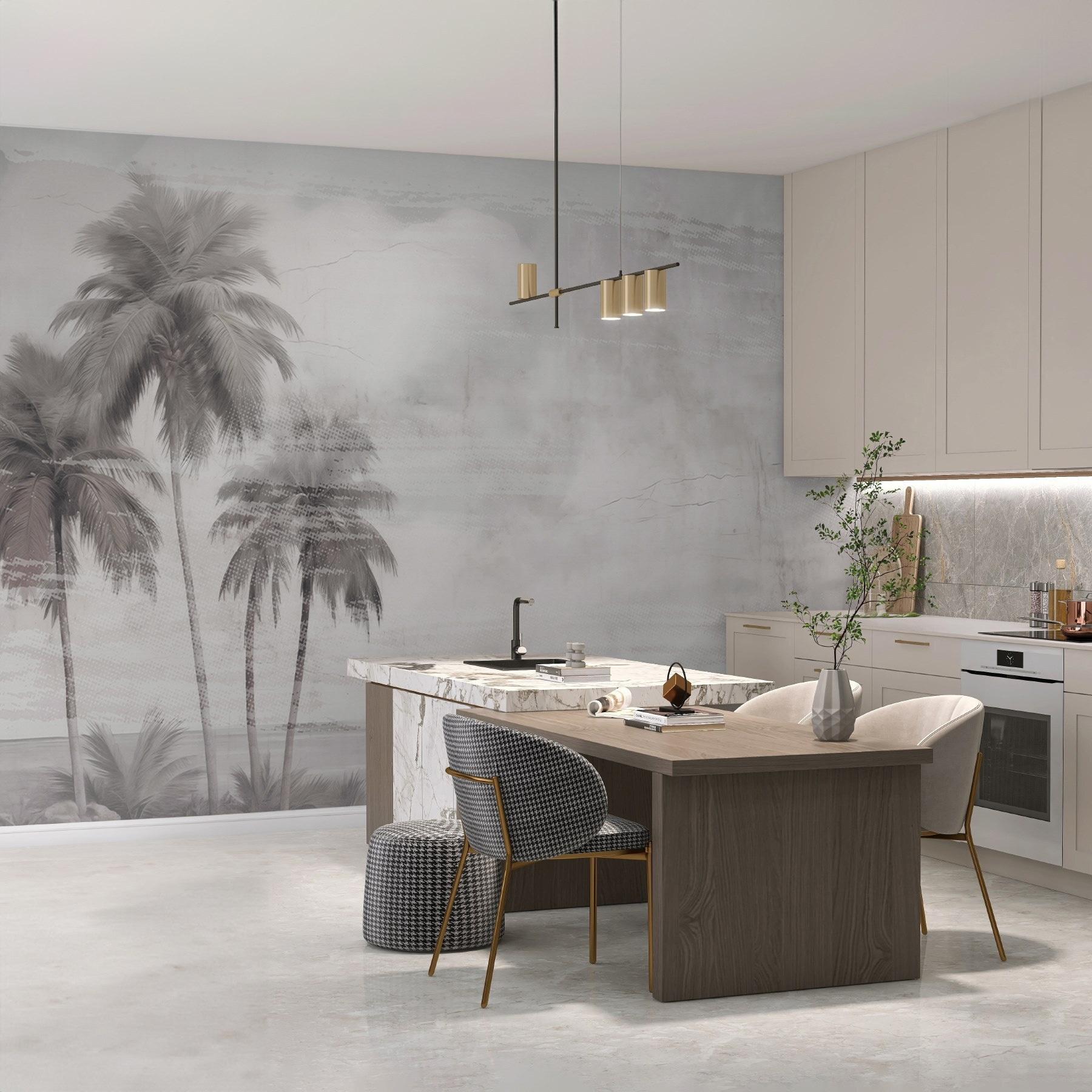 Premeňte svoj priestor na tropický únik s touto úžasnou nástennou maľbou, na ktorej sa na jemnom pozadí elegantne kolíšu palmy. Predstavte si jemné šumenie listov, teplý vánok a sladkú tropickú vôňu. Je ideálna do miestnosti, ktorá potrebuje trochu dovolenkovej atmosféry – myslite na čitateľské kútiky alebo domáce kancelárie. Priatelia sa sem môžu zatúlať a povedať: “Páni, sme na ostrove?” Kvapka dobrodružstva a relaxu stačí na to, aby sa vám rozjasnil deň. Navyše je to ako preniesť si kúsok raja priamo k vám domov. Jednoducho úchvatné!