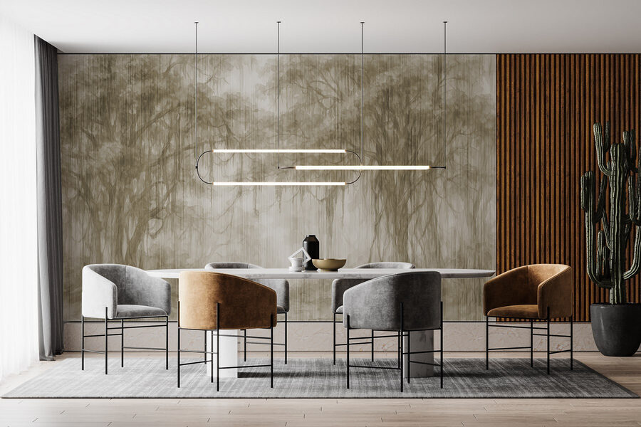 Premeňte akýkoľvek priestor na pokojné útočisko pomocou tejto očarujúcej nástennej maľby so skupinou stromov zahalených v jemnej hmle. Je to ako vstúpiť do pokojného lesa, kde v pozadí hrá jemný šepot prírody. Predstavte si, že popíjate čaj alebo listujete v knihe, zatiaľ čo tieto krásne siluety dodávajú vašim stenám nádych pokoja. Jemné odtiene vytvárajú príjemnú atmosféru, ktorá je ideálna na relaxáciu alebo hlboké rozhovory. Či už je to v útulnej obývačke alebo tichej pracovni, táto nástenná maľba pozýva na teplo a správnu dávku tajomstva. Objímte krásu prírody priamo u vás doma!
