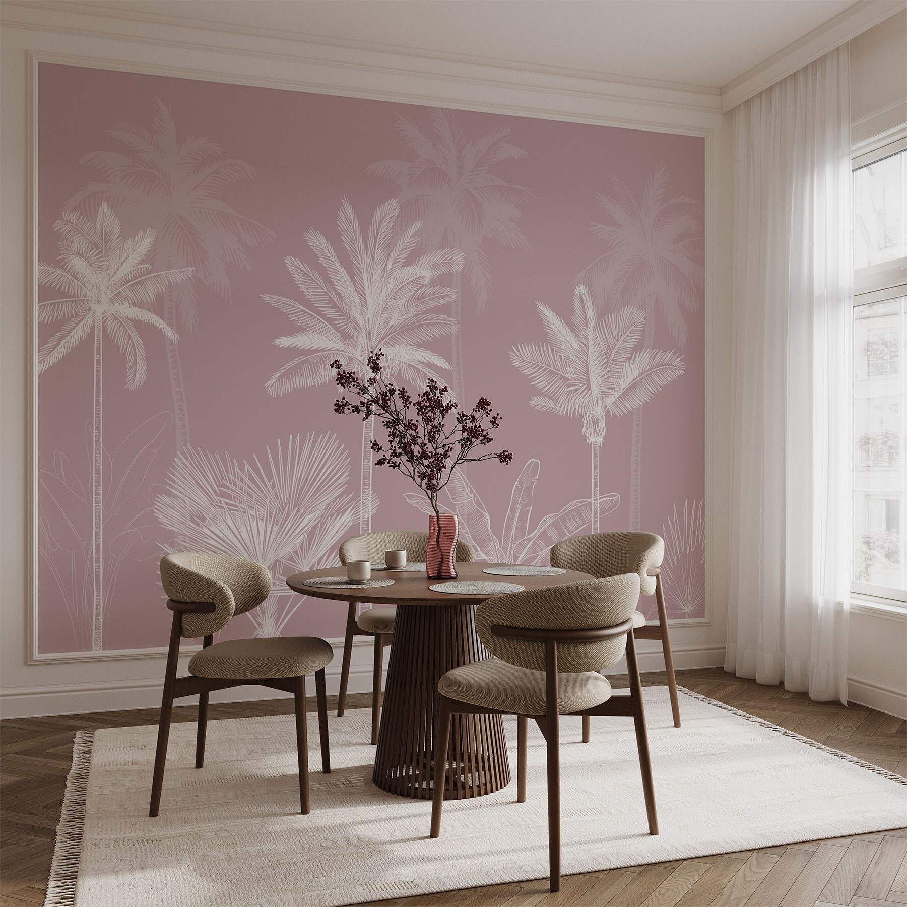Premeňte každú miestnosť pomocou tejto očarujúcej nástennej maľby “Skupina paliem”. Predstavte si, že zakaždým, keď vstúpite do svojho priestoru, vstúpite do pokojnej tropickej krajiny. Jemné, tlmené ružové pozadie nabáda k útulnej atmosfére, takže je dokonalým pozadím pre relaxačný večer po dlhom dni. Je to, akoby váš byt zrazu ovanul oceánsky vánok – bez piesku v topánkach. Tie zložito nakreslené palmy dodávajú nádych elegancie, ale neberú sa príliš vážne. Od obývačky až po domácu kanceláriu, je to hravé prikývnutie prírode, vďaka ktorému sa steny cítia ako živé. Ideálne na snívanie!