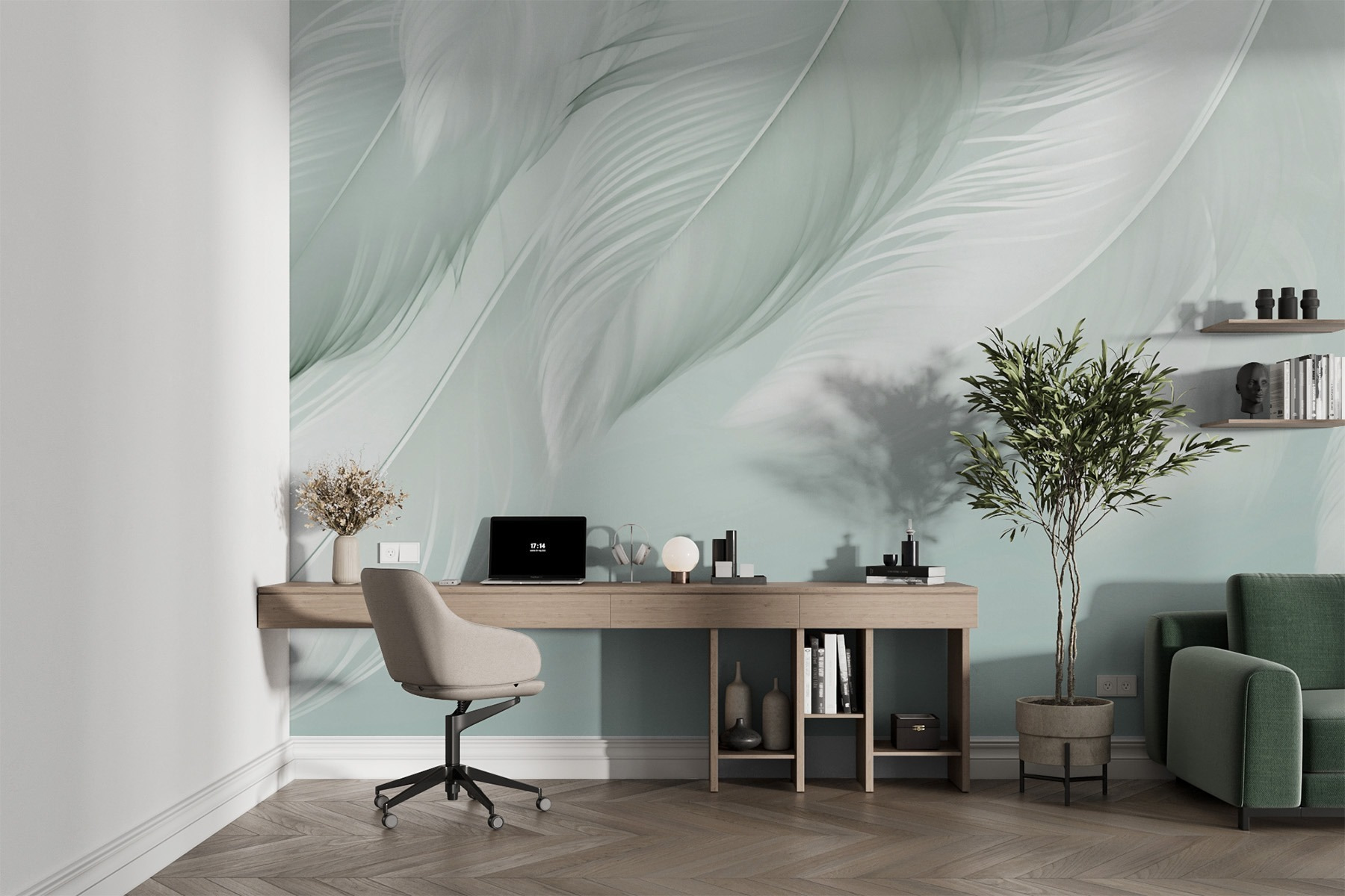 Premeňte nudný priestor na pokojné útočisko pomocou tejto nástennej maľby s jemným bielym perím, ktoré sa jemne vznáša na svetlom pozadí. Predstavte si, že vojdete do miestnosti a okamžite sa budete cítiť ľahšie, ako závan čerstvého vzduchu. Jemný dizajn nabáda k pocitu pokoja, je ideálny pre útulný čitateľský kútik alebo štýlovú spálňu. Skombinujte ho s mäkkými textíliami a teplým osvetlením a máte postarané o lenivé víkendové rána alebo nočné rozhovory s priateľmi. Možno sa dokonca pristihnete pri tom, ako sa vám v mysli sníva, keď sa perie kolíše a prenáša vás na pokojné miesta. Všetko je to o vytvorení zasnenej atmosféry!