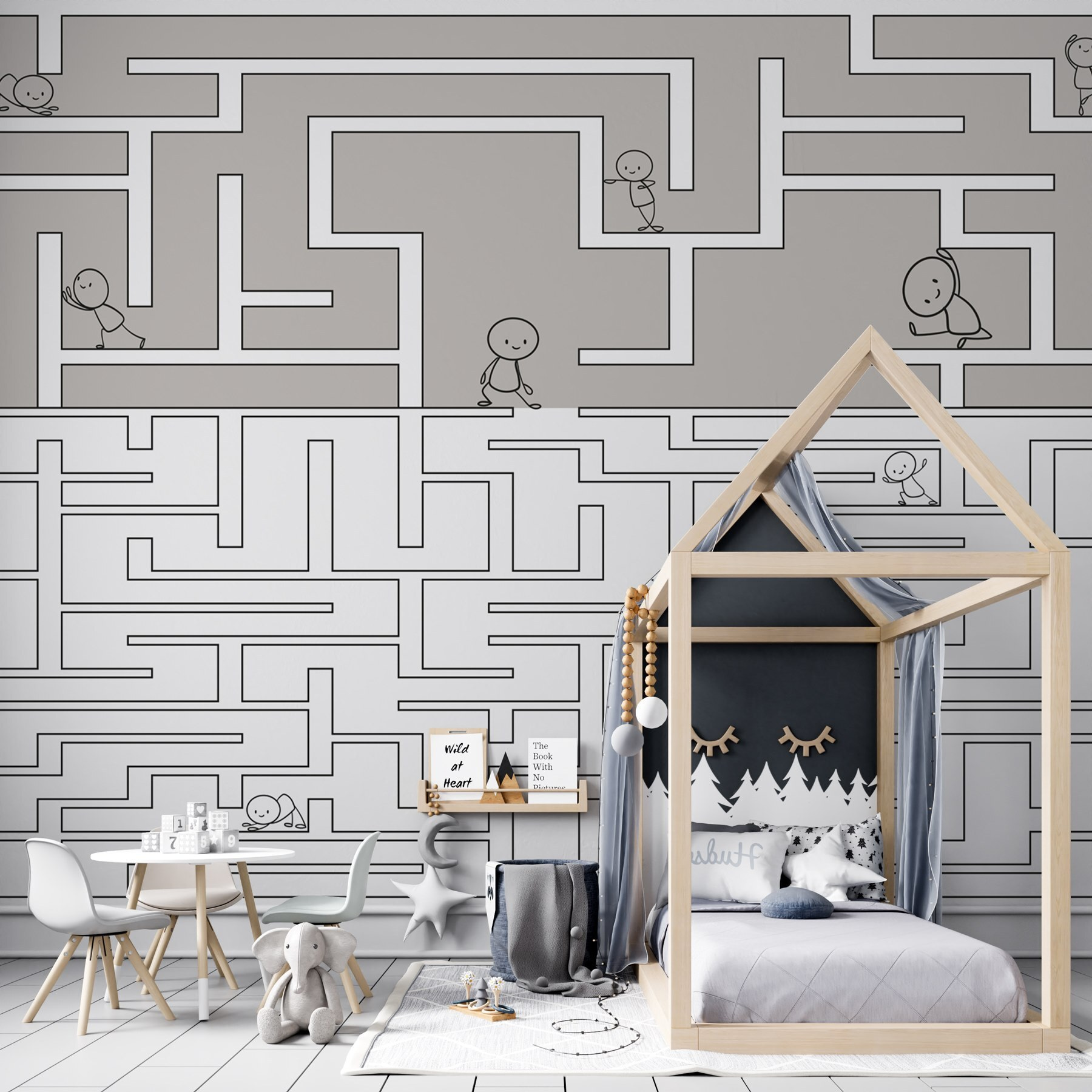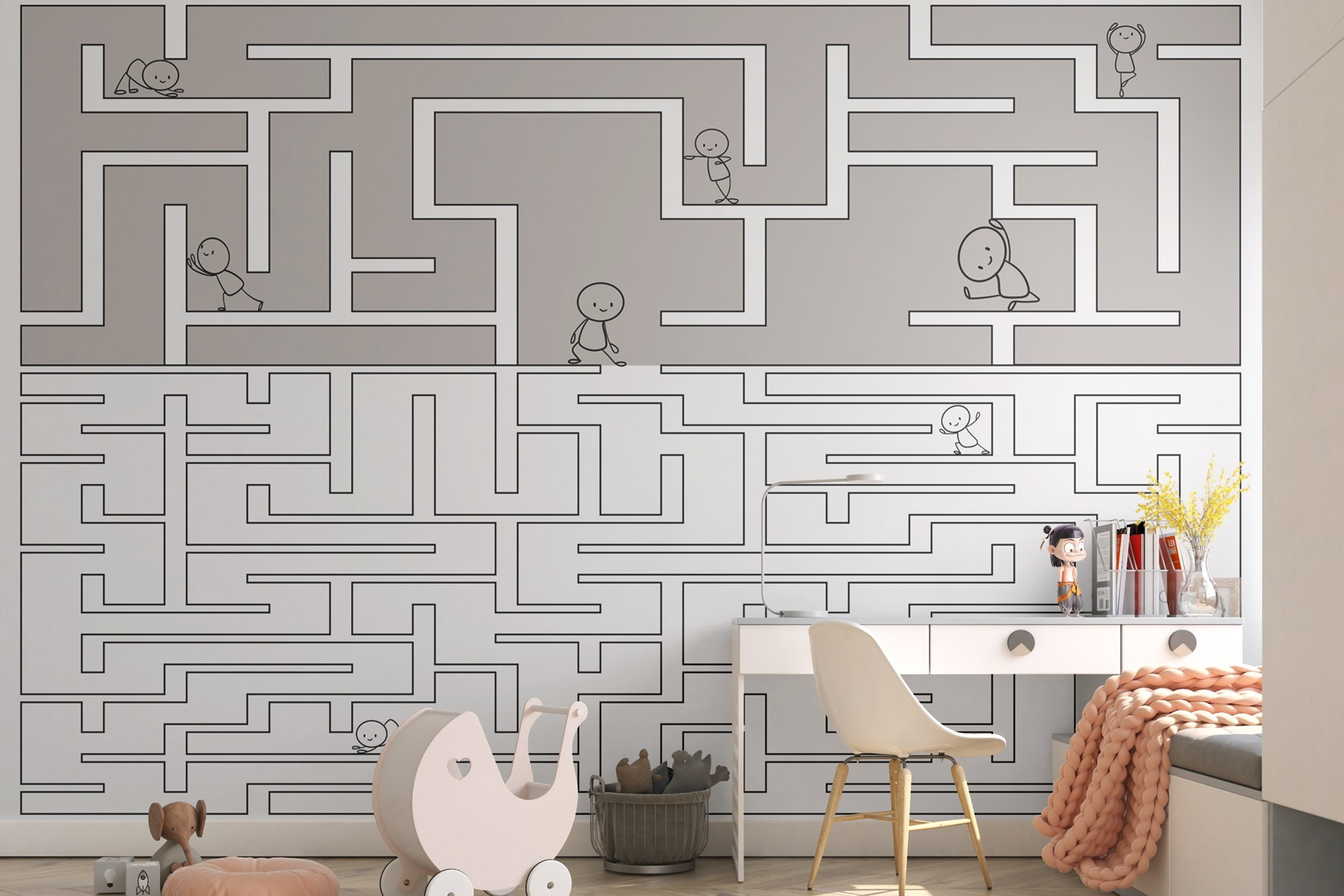 Premeňte jednoduchý priestor na rozmarné dobrodružstvo s touto nástennou maľbou Labyrint! Je to ako mini labyrint priamo na vašej stene – plný priateľských postavičiek, ktoré putujú bludiskom. Predstavte si detskú izbu prekypujúcu zvedavosťou, kde každý pohľad podnecuje predstavivosť.