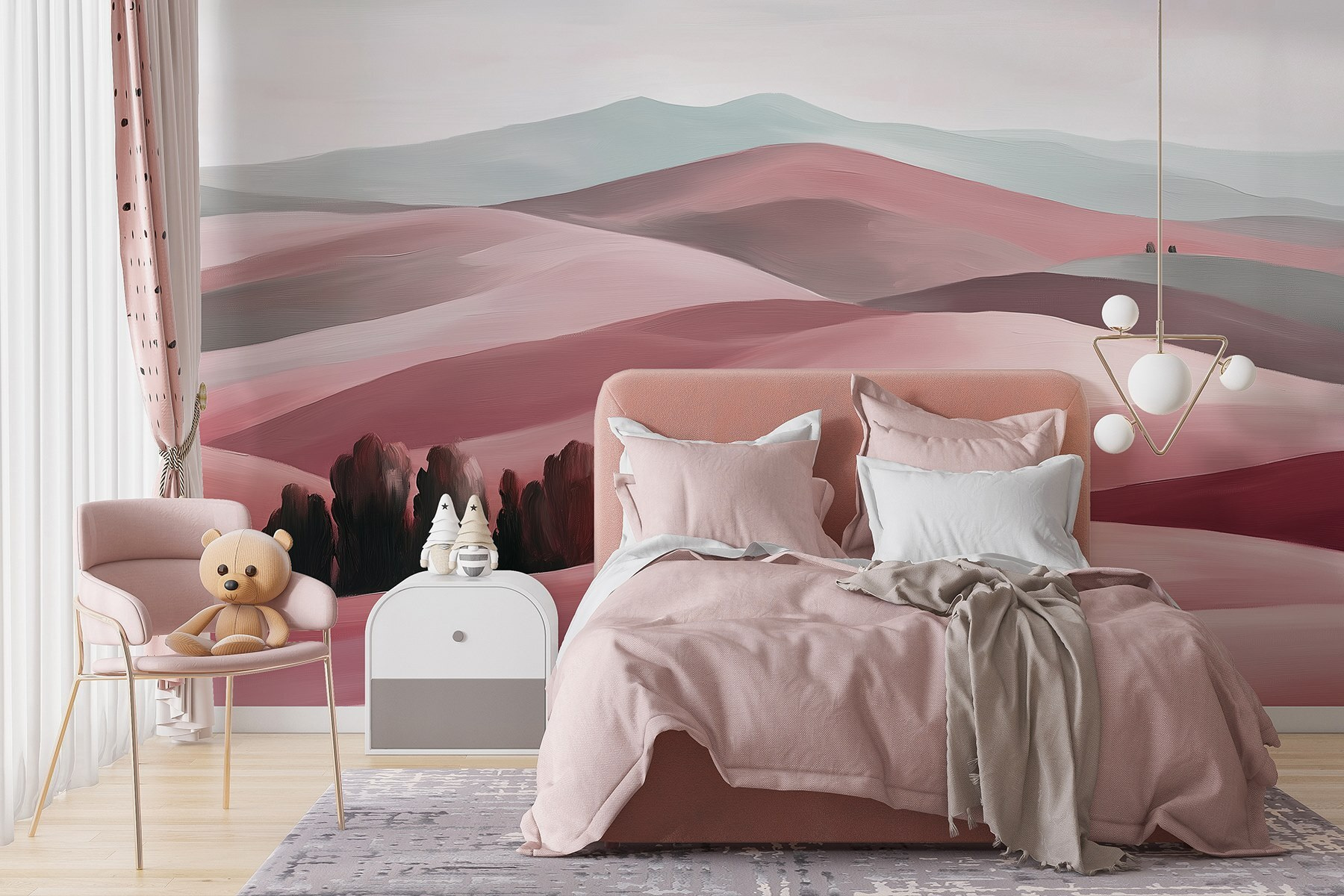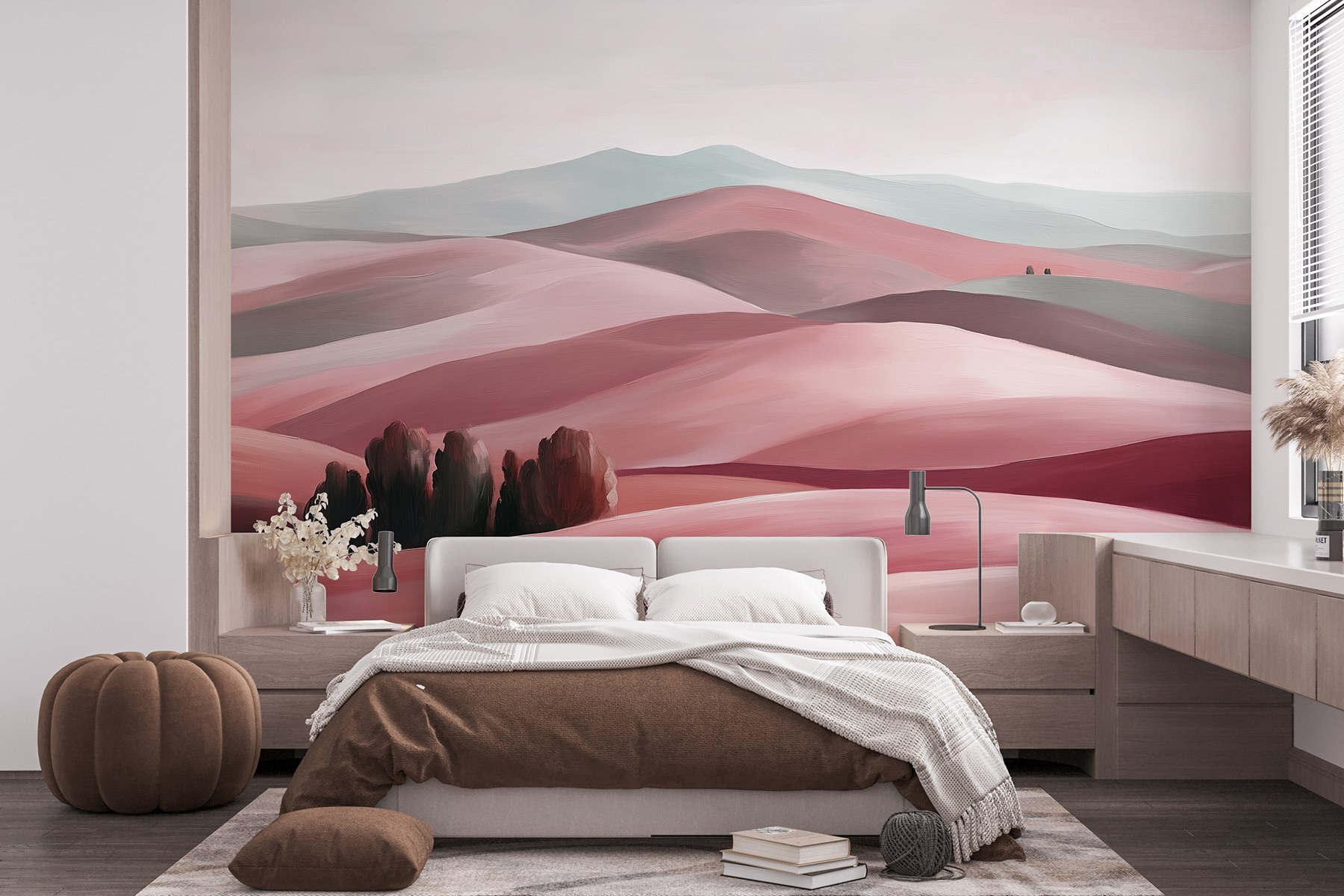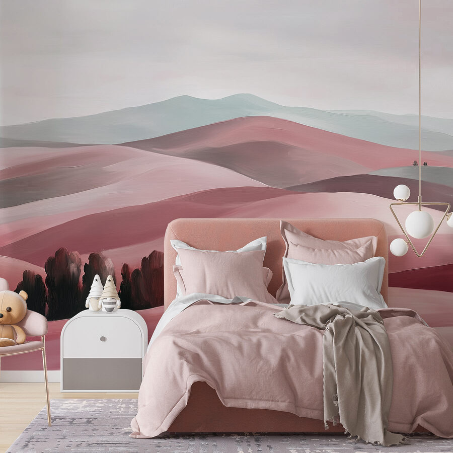 Pomocou nástennej maľby “Krajina kopcov so stromami” premeníte obyčajnú stenu na zasnený únik. Predstavte si, že vstúpite do miestnosti, ktorá okamžite pripomína pokojné útočisko, kde sa pod jemnou oblohou vlnia mierne kopce. Jemné ružové a sivé tóny vyzývajú k pokoju a teplu, ideálne na príjemné rozhovory alebo snívanie pri šálke čaju.