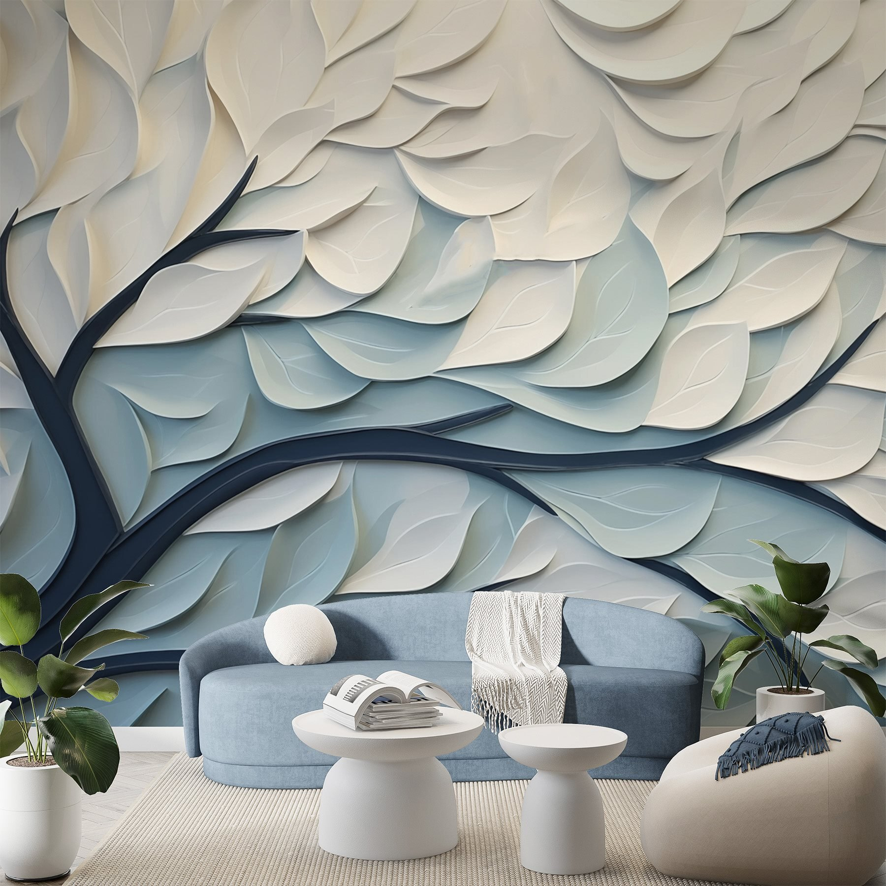 Premeňte akýkoľvek priestor na upokojujúcu oázu pomocou tejto úžasnej nástennej maľby s bielymi a modrými listami. Predstavte si, že vstúpite do miestnosti, kde vetvy siahajú po stene a prinášajú do interiéru prírodu. Jemné farby sú ako jemný vánok v teplý deň, ktorý navodzuje pokoj bez toho, aby kričal o pozornosť. Ideálny do obývačky, spálne alebo aj do útulného zákutia, kde popíjate rannú kávu. Je to ako mať kúsok prírody na dosah ruky – bez potreby záhradníckych zručností. Navyše, kto by neocenil krásne pozadie na spontánne tanečné párty?