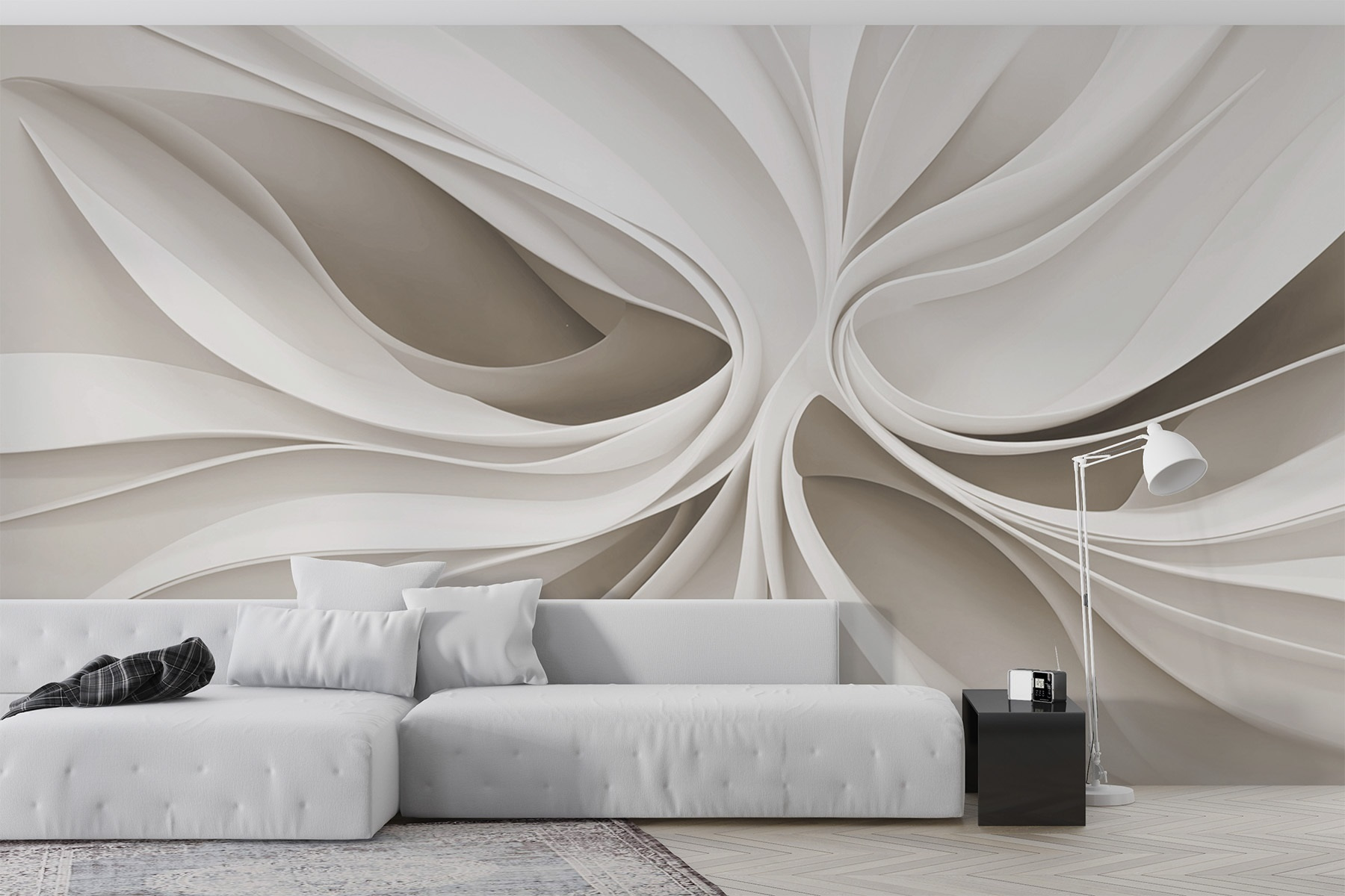 Premeňte každú miestnosť pomocou tejto podmanivej nástennej maľby s bielym vírivým vzorom, ktorý pôsobí moderne a pokojne. Jemné krivky a mäkké línie vytvárajú pocit pohybu ako tanec svetla a tieňa. Predstavte si, že vstúpite do svojho priestoru a privíta vás toto upokojujúce pozadie – je to takmer ako mať umelecké dielo, ktoré vdýchne miestnosti život.