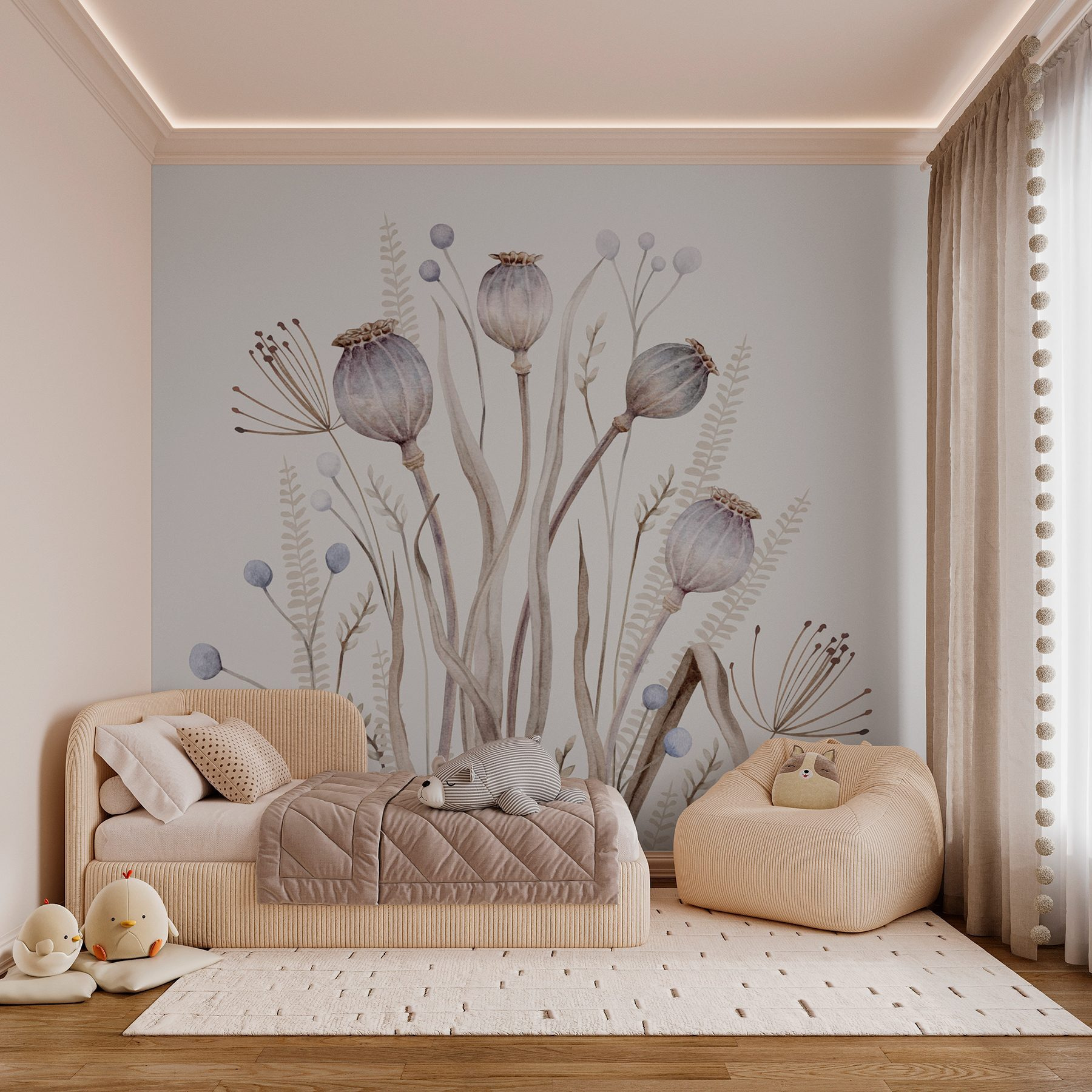 Premeňte akúkoľvek miestnosť na pokojnú záhradu pomocou tejto očarujúcej akvarelovej maľby s kvetmi a rastlinami. Prinesie kvapku prírody priamo na vaše steny a pošepká vášmu priestoru jemnú eleganciu a osviežujúci pôvab. Predstavte si, ako sa každé ráno pri popíjaní kávy prechádzate po pokojnej lúke – znie to snovo, však? Jemné farby vytvárajú pokojnú atmosféru, vďaka čomu sa dokonale hodí do útulných zákutí alebo živých obývacích izieb. Možno sa pri vás dokonca zdržia priatelia, len aby obdivovali váš elegantný dekor. Jednoduchá, štýlová a príťažlivá nástenná maľba je ako závan čerstvého vzduchu – bez alergií!