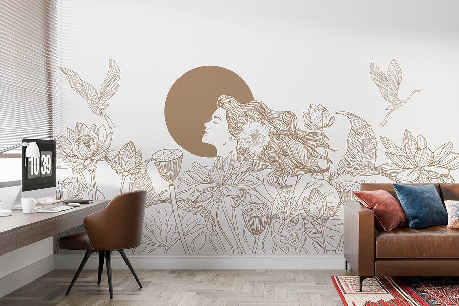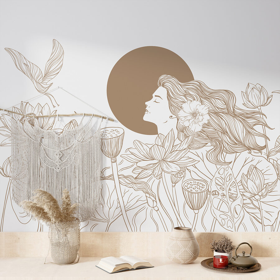 Premeňte akýkoľvek priestor na pokojné útočisko pomocou tejto úžasnej nástennej maľby so ženou obklopenou jemnými kvetmi. Predstavte si to: po dlhom dni vstúpite do svojej izby a privítajú vás upokojujúce kvety a pokojná atmosféra – ako mini útočisko priamo u vás doma. Jemné splývanie jej vlasov a mäkké línie vytvárajú prívetivú atmosféru. Je ideálna do útulného zákutia alebo ako výrazný kúsok, ktorý vyvolá konverzáciu. Predstavte si, že popíjate čaj pri pohľade na tento zasnený výjav a cítite, ako sa stres rozplýva. Jednoduché, ale očarujúce! Vaše steny sa vám poďakujú.