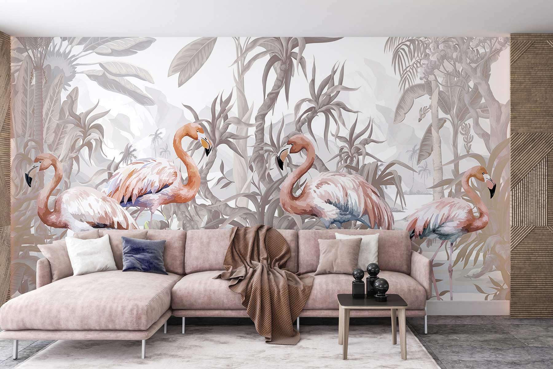 Vstúpte do rozmarného sveta s touto nástennou maľbou plameniaka. Predstavte si, ako popíjate rannú kávu a tieto elegantné vtáky sediace uprostred sviežej tropickej zelene rozjasňujú váš priestor. Jemné odtiene vytvárajú pokojnú atmosféru, takmer akoby ste boli každý deň na mini dovolenke. Perfektne sa hodia na doplnenie obývačky alebo spálne o kúsok prírody. Je to ako mať skrytý kúsok raja priamo na stene. Kto by povedal, že plameniaci môžu byť vašimi novými najlepšími dekoratívnymi priateľmi? Sofistikované perie sa stretáva s uvoľneným šarmom.