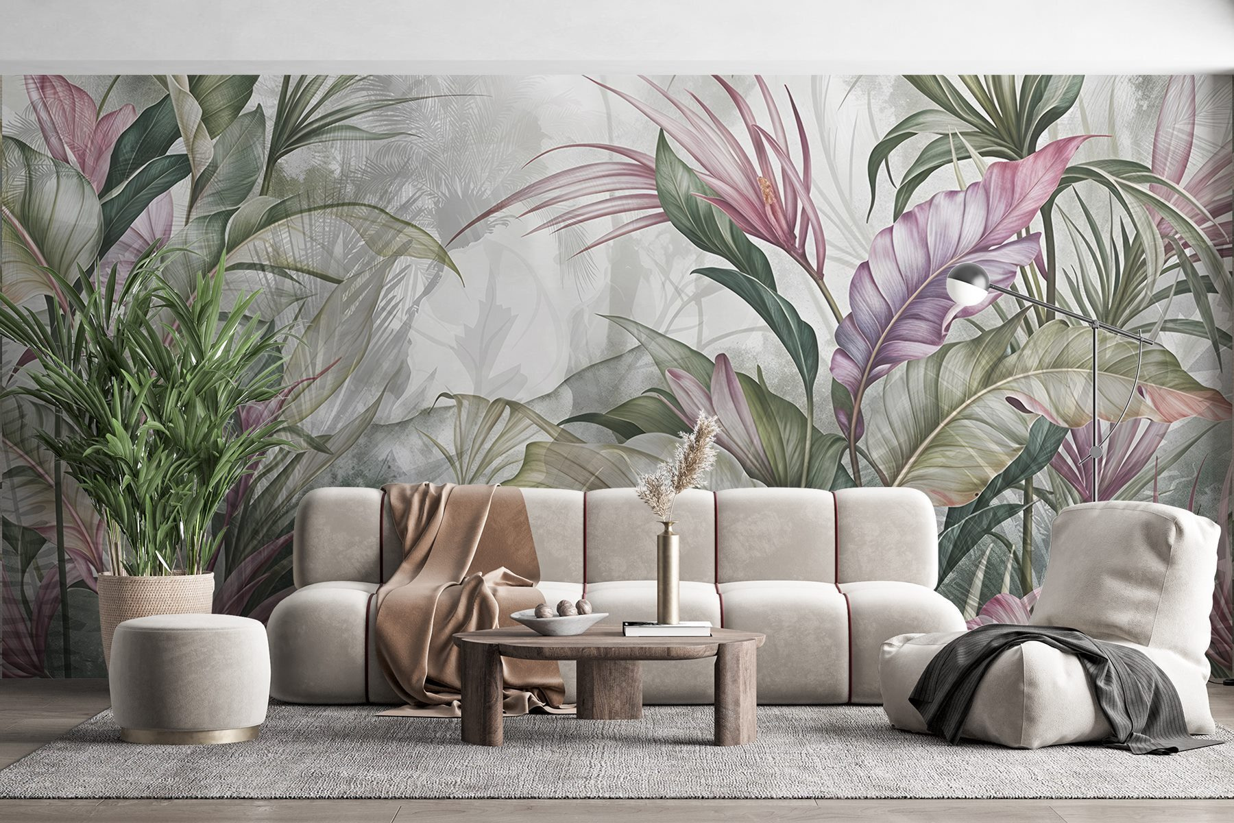 Premeňte akúkoľvek miestnosť na pokojný tropický únik s touto úžasnou nástennou maľbou kvetov a listov. Predstavte si, že sa pri každej prechádzke ponoríte do sviežej oázy – len si predstavte, že ležíte v pohodlnom kresle, popíjate drink a cítite sa ako na dovolenke na pláži. Mäkká zelená a jemná ružová vytvárajú upokojujúcu atmosféru, vďaka čomu je ideálna do obývačky alebo spálne. Navyše dodáva nádych prírody bez toho, aby ste potrebovali zelený palec! Nie je to len dekorácia na stenu; je to každodenná pripomienka, aby ste si uľahčili dýchanie a nasávali dobré vibrácie. Kto by nechcel mať doma kúsok raja?