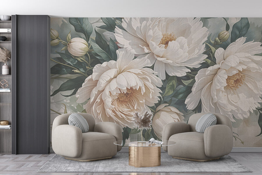 Premeňte akýkoľvek priestor pomocou očarujúcej nástennej maľby “Jemné kvety v jemných odtieňoch”. Predstavte si, že vstúpite do pokojnej záhrady, v ktorej kvitnú pivonky v jemne tienistom šepote bielej a zelenej farby. Tento dizajn prináša nielen krásu, ale aj ovzdušie pokoja, ktoré je ako jemné objatie po dlhom dni. Ideálny do útulného čitateľského kútika alebo zasnenej spálne, je to ako mať v interiéri kúsok prírody. Priatelia sa môžu zastaviť, obdivovať vašu stenu a zrazu ste hostiteľom s najväčším počtom – veľa šťastia, aby sa k vám nenasťahovali! Dodajte svojmu interiéru štipku elegancie, pretože kto by nechcel mať na stene kamaráta s kvetmi?