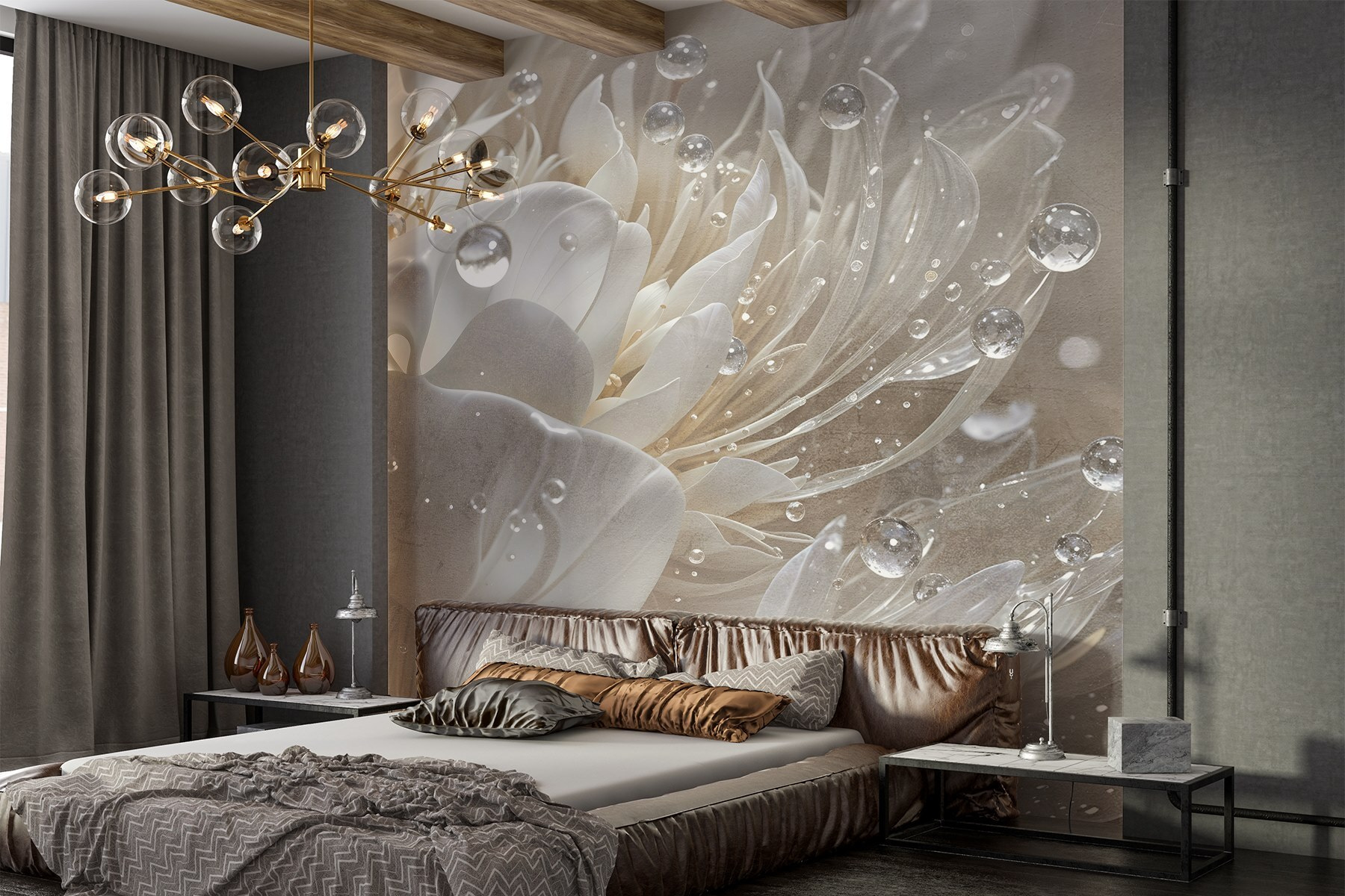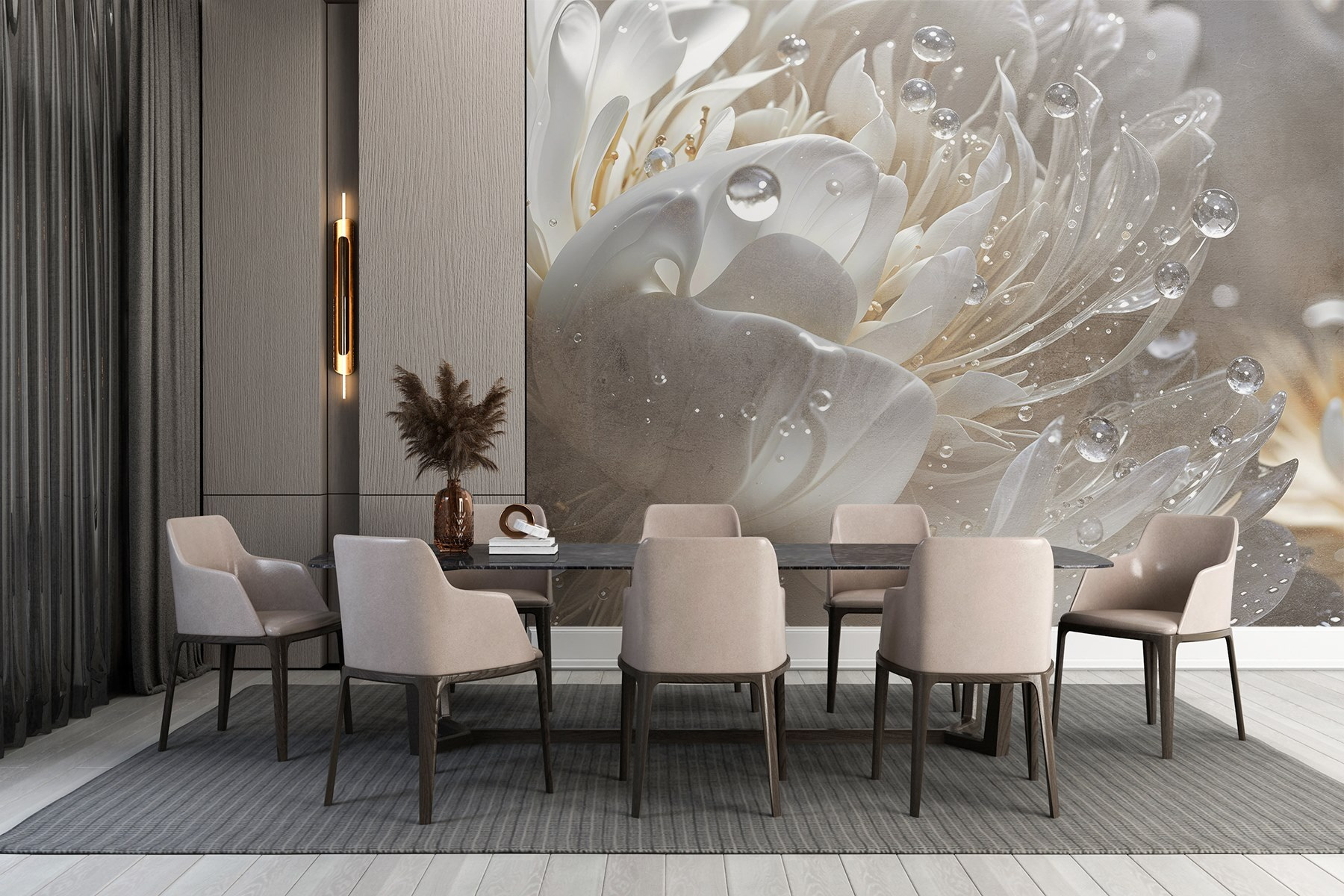 Premeňte svoj priestor pomocou očarujúcej nástennej maľby “Jemné okvetné lístky zdobené kvapkami”. Predstavte si, že sa každý deň prebúdzate s jemným šepotom prírody priamo na vašej stene. Jemné okvetné lístky a trblietavé kvapky vytvárajú pokojnú atmosféru, vďaka ktorej sa každá miestnosť bude cítiť ako v útulnej záhrade. Predstavte si to: popíjanie rannej kávy, zatiaľ čo slnečné svetlo tancuje na týchto detailoch pripomínajúcich rosu – je to dokonalé pokojné útočisko! Či už je to vaša obývacia izba alebo tichý čitateľský kútik, táto nástenná maľba dodáva nádych elegancie a pokoja. Kto by odolal? Je to ako pozvať kúsok jari do vášho domova po celý rok. Navyše nepotrebujete žiadny zelený palec!