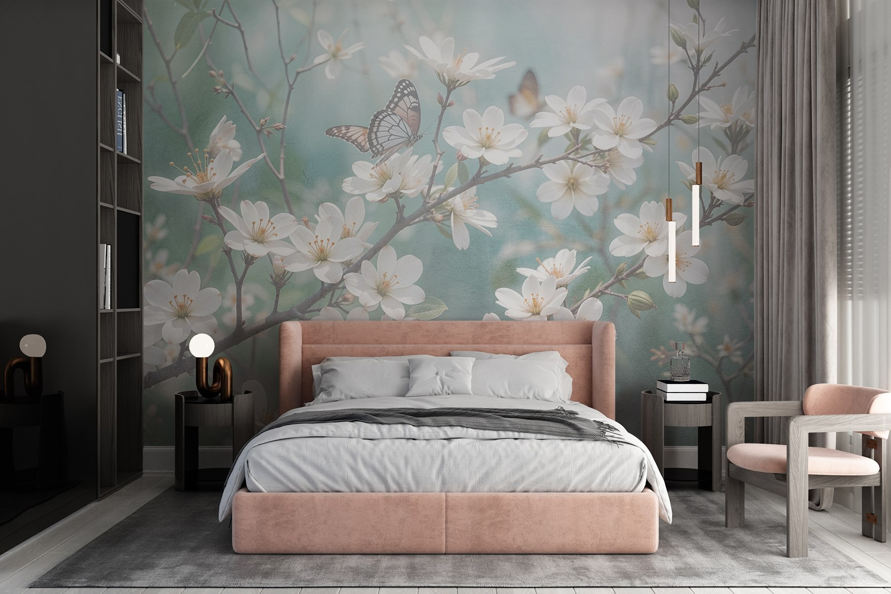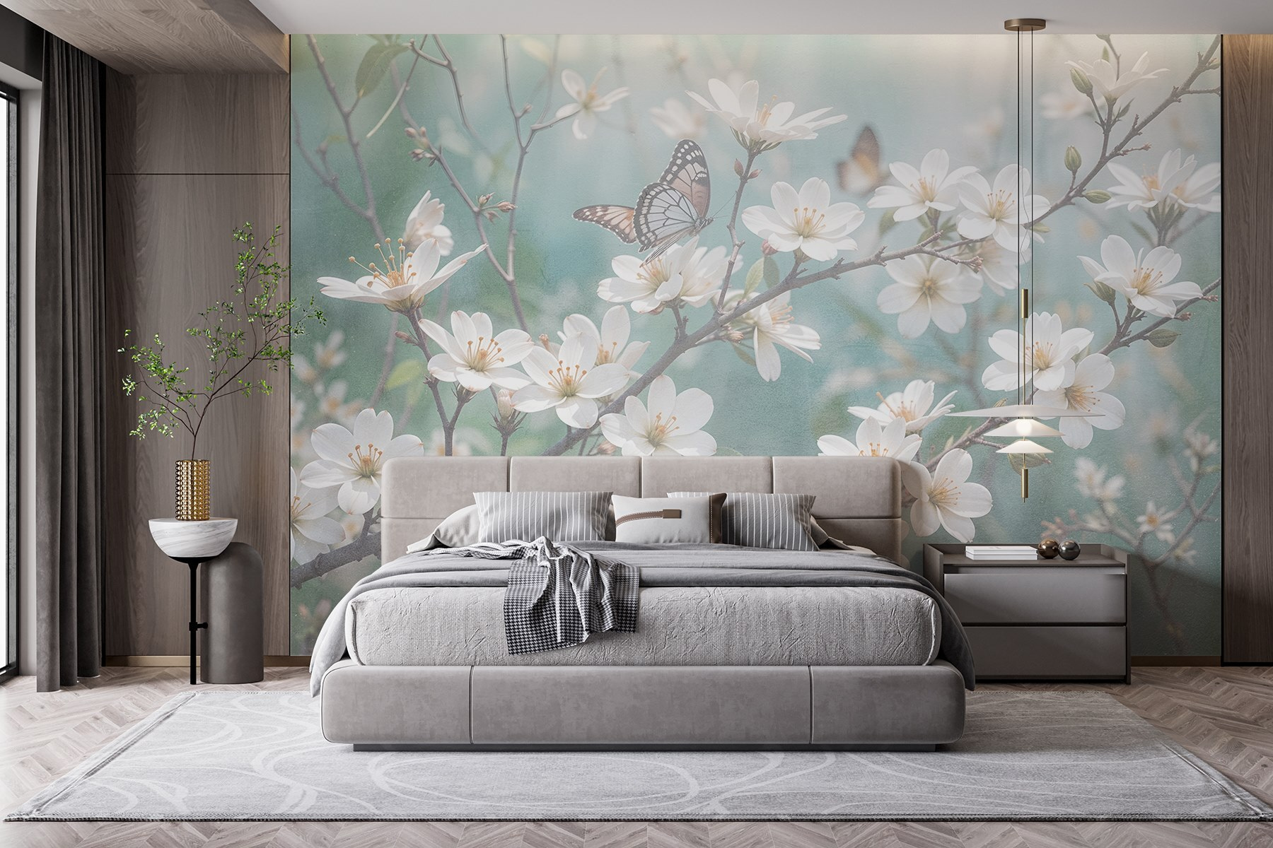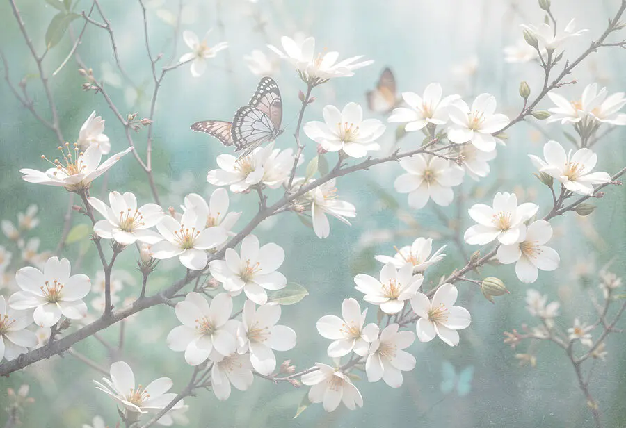 Premeňte svoj priestor pomocou očarujúcej nástennej maľby “Motýľ na bielom kvete”. Predstavte si pokojnú japonskú záhradu priamo vo vašej obývačke. Jemné motýle tejto nástennej maľby poletujúce nad čisto bielymi kvetmi vytvárajú zasnený únik. Pri každom pohľade máte pocit, že ste vstúpili do pokojného popoludnia plného jemného vánku a sladkej vône kvetov. Ideálny pre každého, kto chce svojmu domovu dodať nádych kúzla prírody. Je to ako priniesť do interiéru kúsok pokoja – kto by to nechcel? Či už v útulnom kúte alebo ako výrazný kúsok, táto nástenná maľba určite vyvolá radosť a inšpiruje k snívaniu.