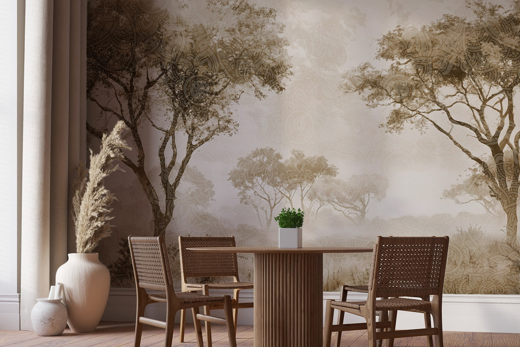 Premeňte svoj priestor pomocou očarujúcej nástennej maľby “Skupina stromov v poli”. Nie je to len umenie – je to upokojujúci únik priamo u vás doma. Predstavte si, že sa zobudíte do pokojnej krajiny, kde stromy takmer šepkajú príbehy vánku. Jemné zemité tóny vytvárajú útulnú atmosféru, vďaka ktorej sa lenivé popoludnia budú cítiť ešte príjemnejšie. Predstavte si šálku kávy v ruke, žiadny zhon, len vy a táto pokojná scéna. Ideálny pre milovníkov prírody, dodá teplo a osobitosť každej miestnosti. Smelo do toho, nechajte svoje steny dýchať malým kúzlom!