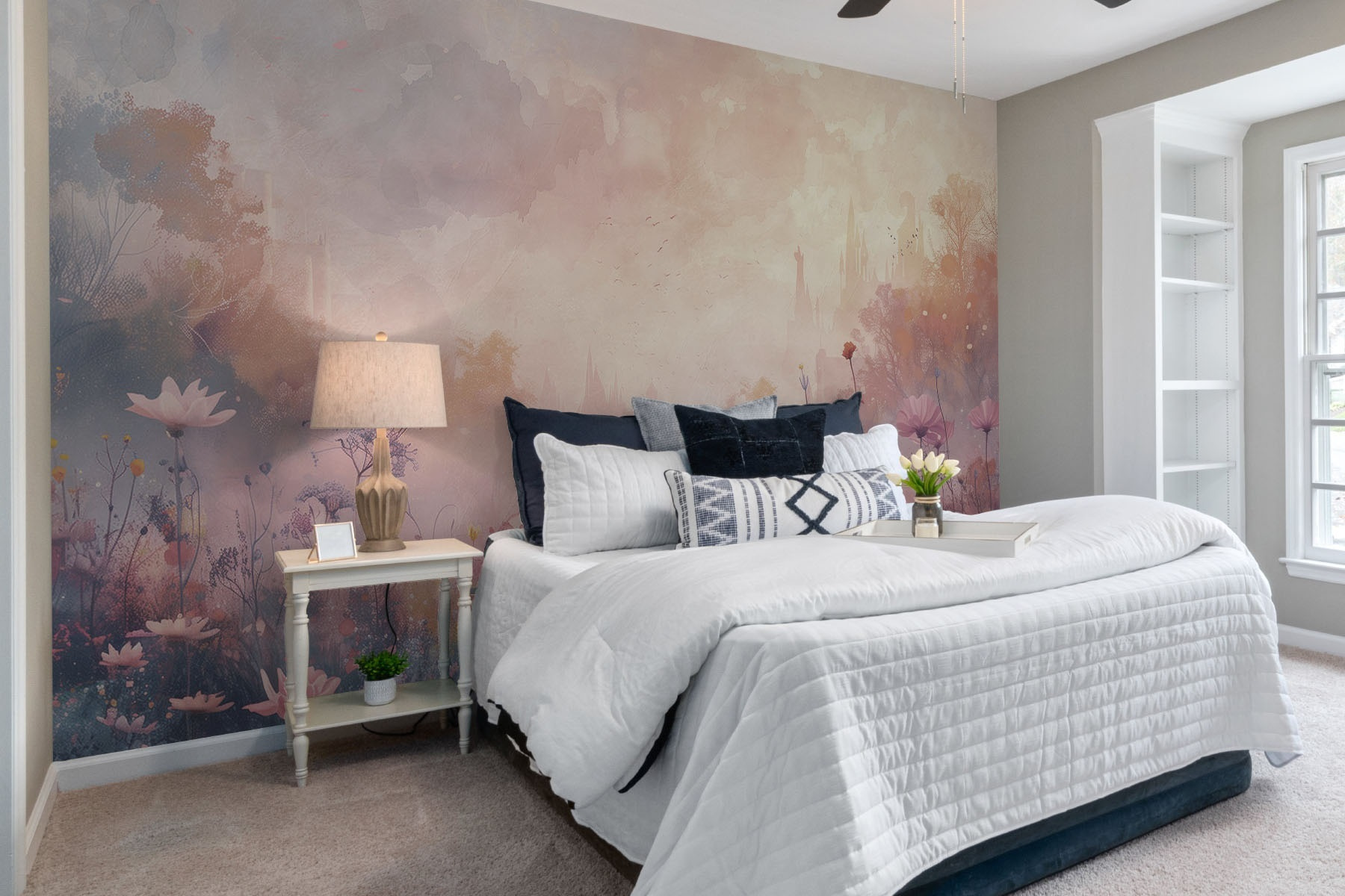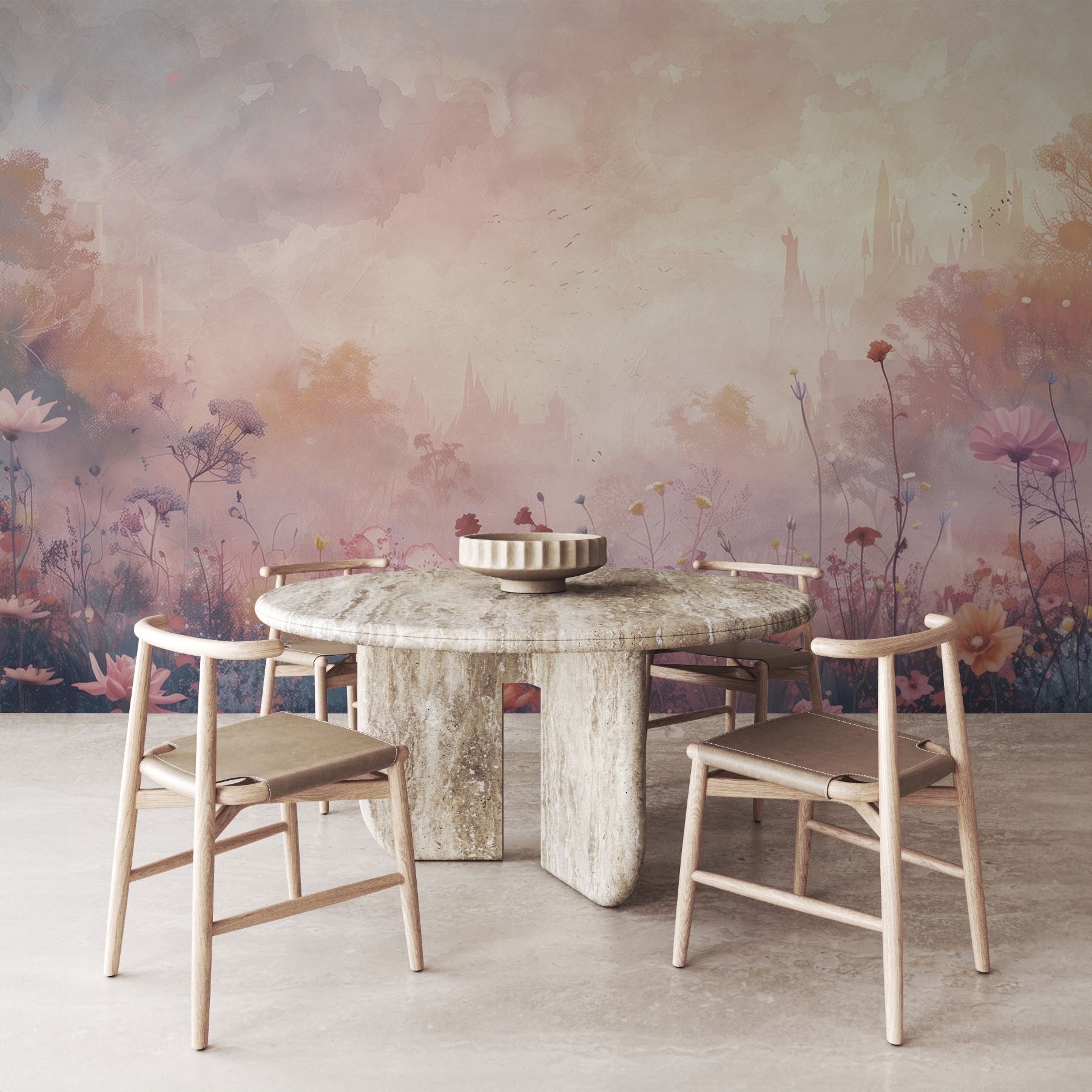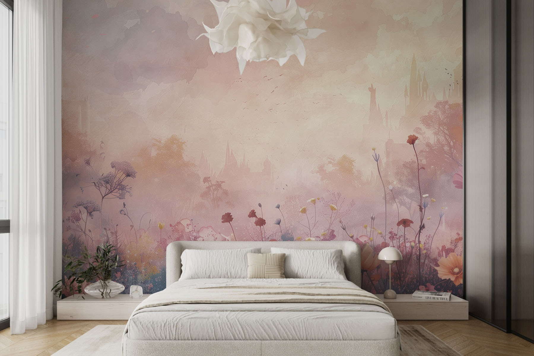 Premeňte svoj priestor pomocou tejto zasnenej nástennej maľby s poľom rozkvitnutých kvetov na pozadí rozmarného hradu. Predstavte si, že vstúpite do pokojnej záhrady, kde každý okvetný lístok rozpráva príbeh a jemné odtiene šepkajú pokoj. Je to ako preniesť kúsok prírody do interiéru – bez potreby zeleného palca. Táto nástenná maľba, ktorá je ideálna do útulného zákutia alebo živej detskej izby, nabáda k dennému snívaniu a nezáväzným rozhovorom o obľúbených rozprávkach. Len si to predstavte: uvelebený s dobrou knihou, obklopený živými kvetmi a náznakom dobrodružstva, ktoré čaká hneď za hradbami hradu.