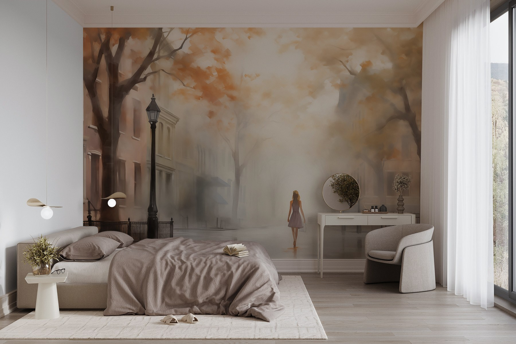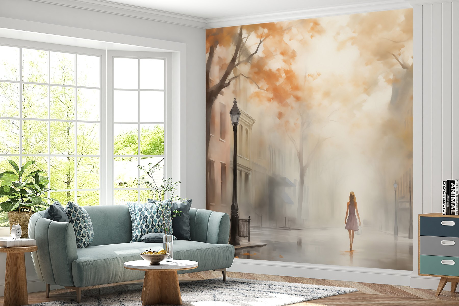 Predstavte si to: žena kráčajúca po hmlistej ulici, zahalená do teplých odtieňov jesene. Táto nástenná maľba nie je len umením, je to brána do zasneného úniku. Predstavte si, že rozžiari vašu obývačku alebo útulnú spálňu a pritiahne každého, kto ju zahliadne. Hmla vytvára pocit tajomstva, vďaka ktorému sa každý pohľad javí ako dobrodružstvo. Navyše, tá nostalgická atmosféra? Ideálna na večery strávené spomínaním alebo plánovaním ďalšieho úteku. Je to ako pozvať pokojný kúsok mestského života priamo k vám domov, jeden zasnený krok za druhým – taká atmosféra!
