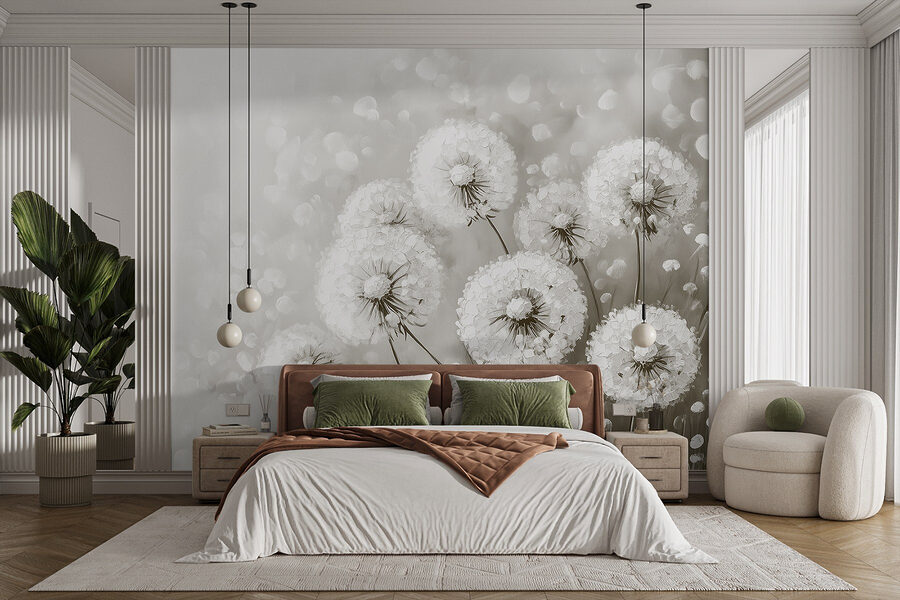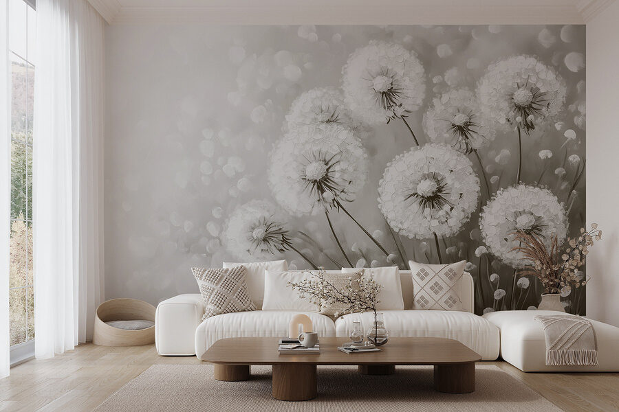 Predstavte si, že vstúpite do miestnosti, ktorá dýcha pokojom a pohodou. Táto nástenná maľba “Skupina púpav s bielymi kvetmi” to dokáže. Jemné, zasnené tóny vytvárajú pokojné pozadie, v ktorom sa zdá, že sa čas spomalil. Predstavte si to: chúlite sa s knihou a tapeta rámuje váš útulný kútik ako jemné objatie od prírody. Tie nadýchané púpavy? Sú ako malé želania, ktoré čakajú, kým odplávajú. Je to takmer poetické! Tapeta je ideálna na oživenie akéhokoľvek priestoru, vyvoláva pocit rozmarnosti bez toho, aby bola príliš okázalá. Prijmite krásu jednoduchosti – je to ako vniesť do interiéru kúsok prírody, bez chrobákov!