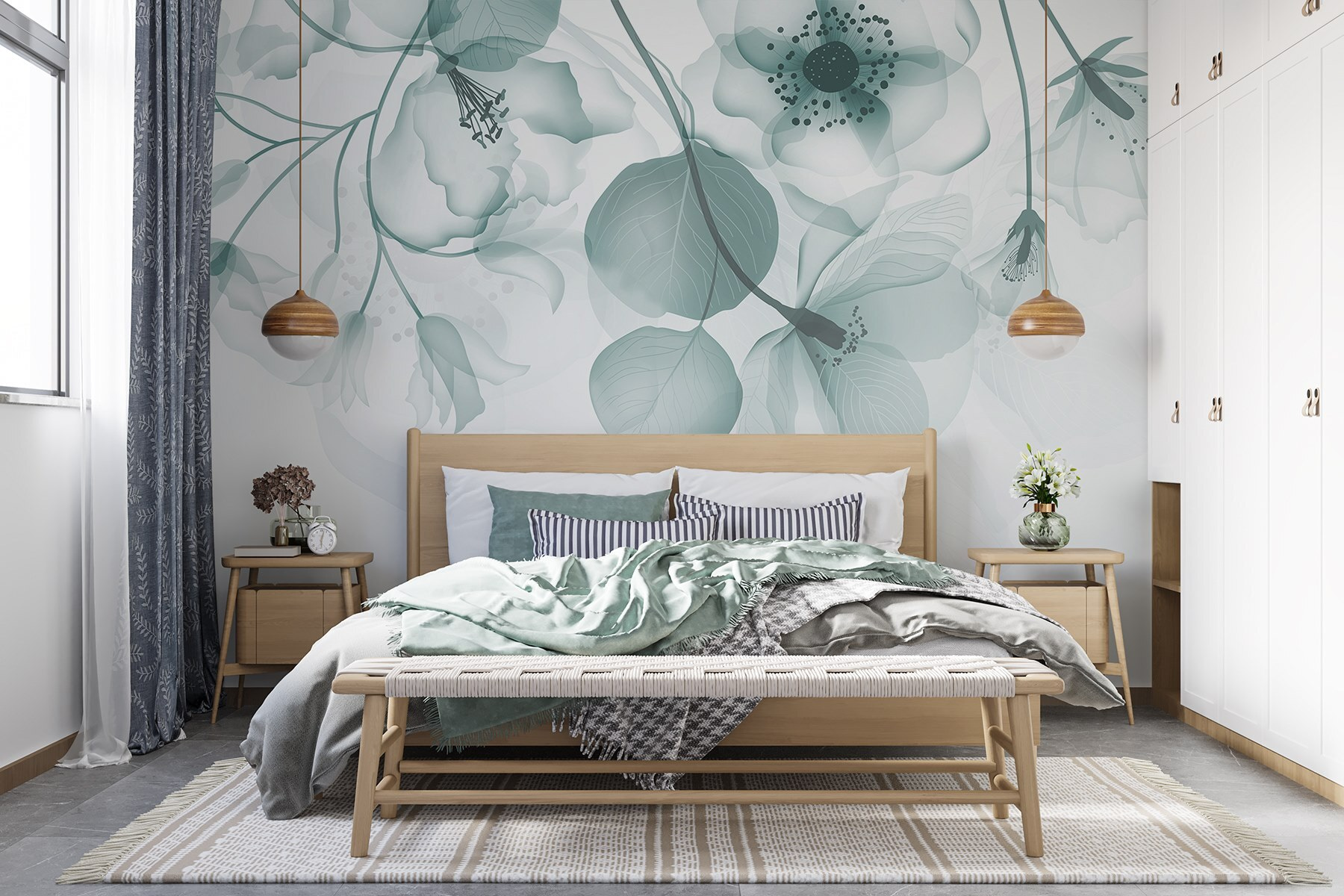 Premeňte svoj priestor pomocou očarujúcej nástennej maľby “Priehľadné kvety s listami”. Je to ako preniesť pokojnú japonskú záhradu priamo k vám domov – bez otravných záhradných trpaslíkov. Predstavte si, že sa zobudíte a privítajú vás jemné okvetné lístky a jemne sa kývajúce listy, všetko v jemných akvarelových odtieňoch. Zmes zelenej a bielej dodáva nádych pokoja, ktorý je ideálny pre útulný čitateľský kútik alebo zasnenú spálňu. Každý pohľad je ako malý závan čerstvého vzduchu. Či už hostíte priateľov, alebo si len užívate lenivú nedeľu, táto nástenná maľba navodí tú správnu náladu. Kto by povedal, že stena môže priniesť taký pokoj?