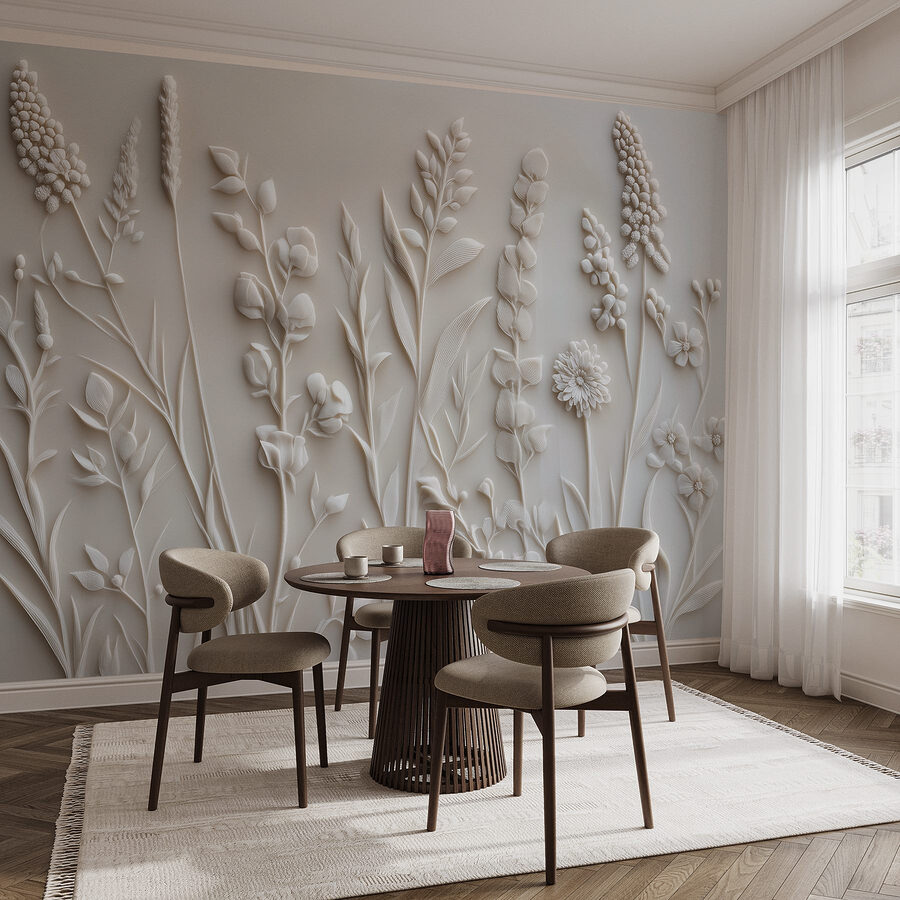 Premeňte svoj priestor pomocou tejto úžasnej nástennej maľby s jemným vzorom bielych kvetov a listov. Predstavte si, že vojdete do miestnosti plnej jemných dotykov prírody, kde každý pohľad pôsobí ako závan čerstvého vzduchu. Táto nástenná maľba tam len tak nesedí, ale pozýva vás dovnútra a takmer vám našepkáva príbehy o pokojných záhradách a lenivých popoludniach. Je ideálna na vytvorenie oázy pokoja vo vašom dome, je to ako mať tajnú záhradu priamo na stene. Či už si varíte kávu, alebo relaxujete s knihou, tento dizajn dodáva elegantnú, prírodou inšpirovanú atmosféru, vďaka ktorej je každá chvíľa o niečo sladšia. Je jednoduchý, ale nápadný – nádherné pozadie, ktoré dokáže svojou ľahkou eleganciou vyvolať radosť. Kto by sa nechcel obklopiť práve takýmto?