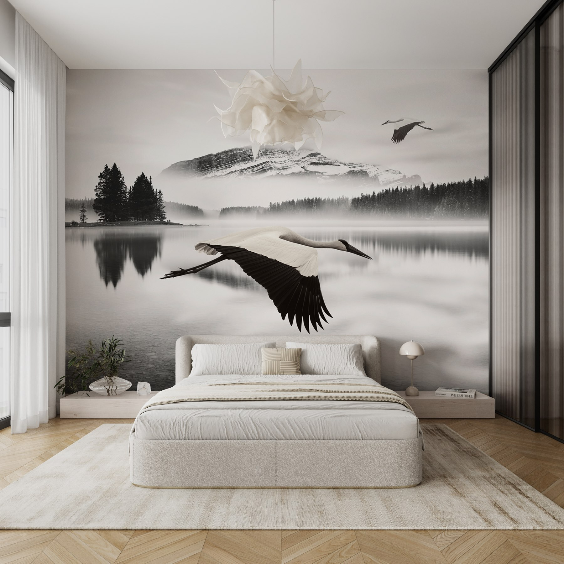 Premeňte svoj priestor pomocou tejto úchvatnej nástennej maľby “Vták letiaci nad vodou”. Predstavte si pokojnú krajinu, v ktorej ladný žeriav plachtí cez hmlisté jazero a vyžaruje pokoj. Je to ako preniesť si kúsok prírody do interiéru – nie sú potrebné zablatené topánky ani sprej proti hmyzu! Táto nástenná maľba je ideálna na prázdnu stenu, ktorá si žiada nejakú osobnosť, a do vášho hektického dňa vnesie pokoj.
