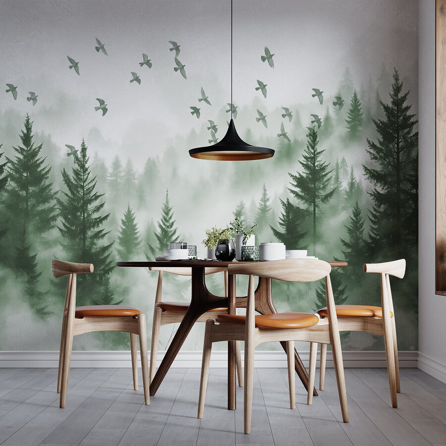 Premeňte akýkoľvek priestor pomocou očarujúcej nástennej maľby “Vtáky letia nad lesom”. Predstavte si, že sa každý deň prebúdzate do pokojného hmlistého lesa, kde každý detail našepkáva pokoj. Tieto pôvabné vtáky vznášajúce sa nad vami dodajú vašim stenám nádych kúzla a slobody. Je ideálna do útulných izieb alebo živých obývačiek – všade tam, kde by sa hodila štipka kúzla prírody. Navyše, kto by sa nechcel cítiť ako v zasnenom lesnom útočisku zakaždým, keď vstúpi? Táto nástenná maľba, ktorá sa ľahko aplikuje a určite vyvolá závisť, vás svojou jemnou zeleňou a upokojujúcou atmosférou možno prinúti zabudnúť na vonkajší svet. Ideálne pre snívajúcich ľudí a milovníkov prírody!
