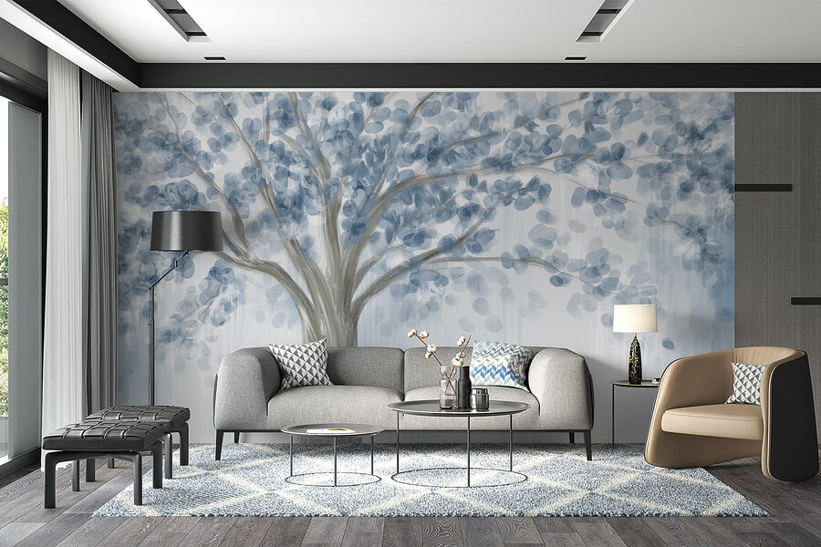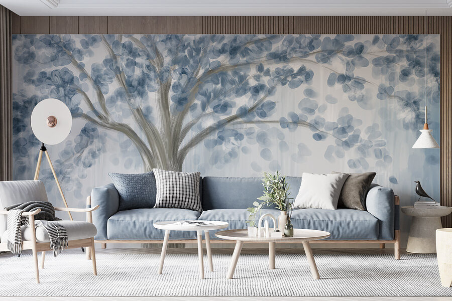 Premeňte akýkoľvek priestor pomocou očarujúcej nástennej maľby “Strom s modrými listami”. Tento úžasný kúsok vyvažuje vzdušnú modrú a jemnú sivú farbu, čím navodzuje pokojný pocit, akoby ste sa prechádzali pokojným lesom. Predstavte si, že popíjate kávu a pritom sa pozeráte na tieto zasnené konáre – cítite vôňu čerstvého vzduchu? Bez námahy sa hodí k modernej alebo rustikálnej atmosfére, takže je dostatočne univerzálny pre útulný kútik alebo živší priestor. Navyše je dokonalým podnetom na konverzáciu, vyvoláva príbehy o prírode a dobrodružstvách. Vneste do interiéru nádych prírody a nechajte svoje steny dýchať!