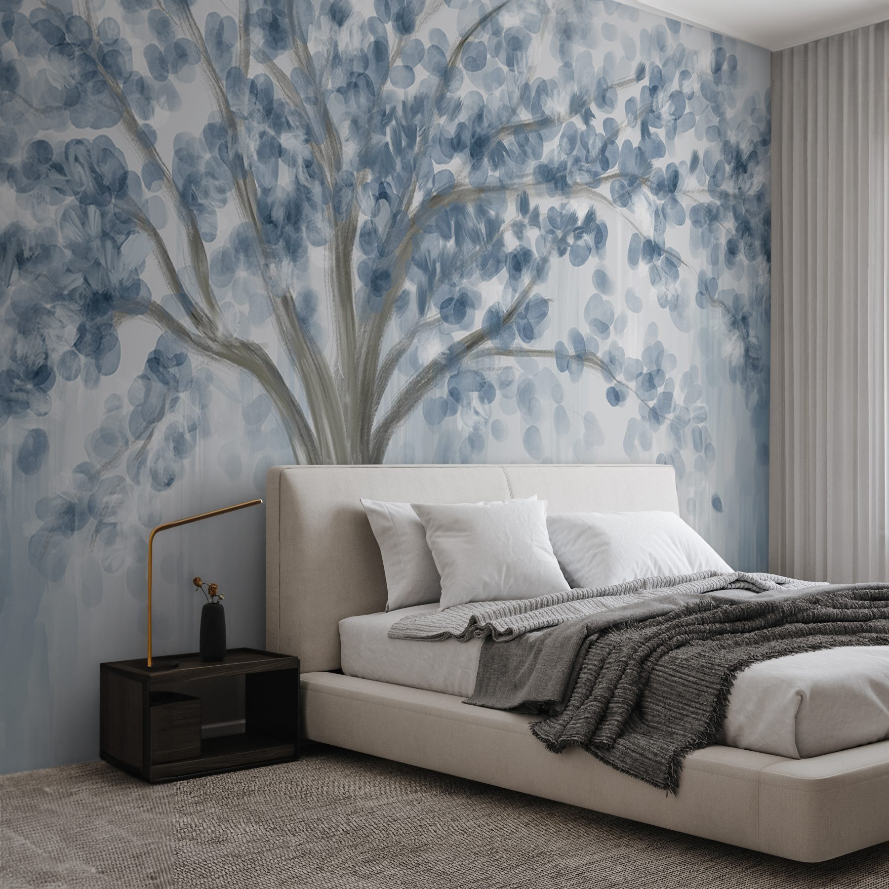 Premeňte akýkoľvek priestor pomocou očarujúcej nástennej maľby “Strom s modrými listami”. Tento úžasný kúsok vyvažuje vzdušnú modrú a jemnú sivú farbu, čím navodzuje pokojný pocit, akoby ste sa prechádzali pokojným lesom. Predstavte si, že popíjate kávu a pritom sa pozeráte na tieto zasnené konáre – cítite vôňu čerstvého vzduchu? Bez námahy sa hodí k modernej alebo rustikálnej atmosfére, takže je dostatočne univerzálny pre útulný kútik alebo živší priestor. Navyše je dokonalým podnetom na konverzáciu, vyvoláva príbehy o prírode a dobrodružstvách. Vneste do interiéru nádych prírody a nechajte svoje steny dýchať!