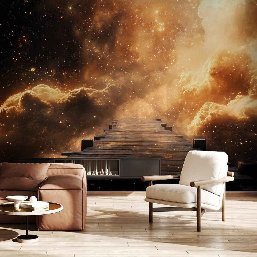 Premeňte svoj priestor s tapetou „Drevený most vedúci k oblakom“. Predstavte si, že vstúpite na ošúchaný drevený most, ktorý sa zdá byť predĺžený do snovitej galaxie. Vyvoláva pocit dobrodružstva, ako keby ste sa pýtali: „Kde skončím?“ Živé farby spájajú teplé a studené tóny a vytvárajú magické pozadie, ktoré prebúdza fantáziu. Predstavte si tie tiché rána, keď popíjate kávu a hľadíte na oblohu posiatu hviezdami a mrakmi – čistá blaženosť. Je to ideálne na podnietenie kreativity alebo jednoducho na snenie. Táto tapeta má tú jednoduchú eleganciu, ktorá vnesie do vášho domova nádych fantázie. Kto by nechcel občas uniknúť do oblakov?