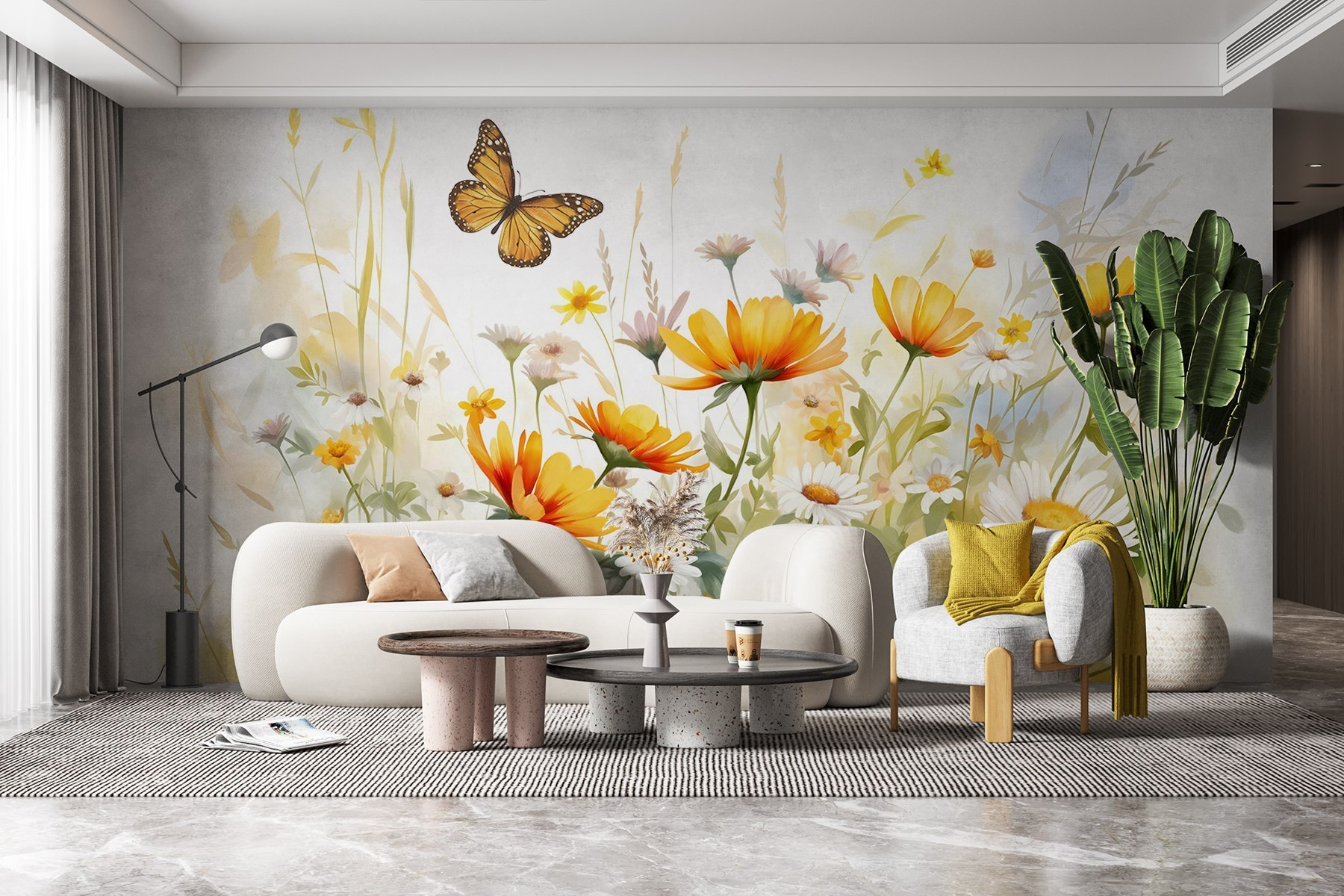 Premeňte svoj priestor na živú záhradu s touto úžasnou nástennou maľbou motýľa poletujúceho nad poľom kvetov. Prináša hravý nádych prírody, vďaka ktorému sa každá miestnosť bude cítiť sviežo a príjemne. Predstavte si, ako popíjate kávu a kocháte sa týmto veselým výjavom – je to ako mať kúsok jari priamo na stene, bez bolesti hlavy z peľu. Výbuchy farieb vám môžu zlepšiť náladu a inšpirovať vaše okolie. Je to dokonalé pozadie pre útulný čitateľský kútik alebo živú herňu. Kto by sa nechcel ponoriť do tejto kvetinovej fantázie?
